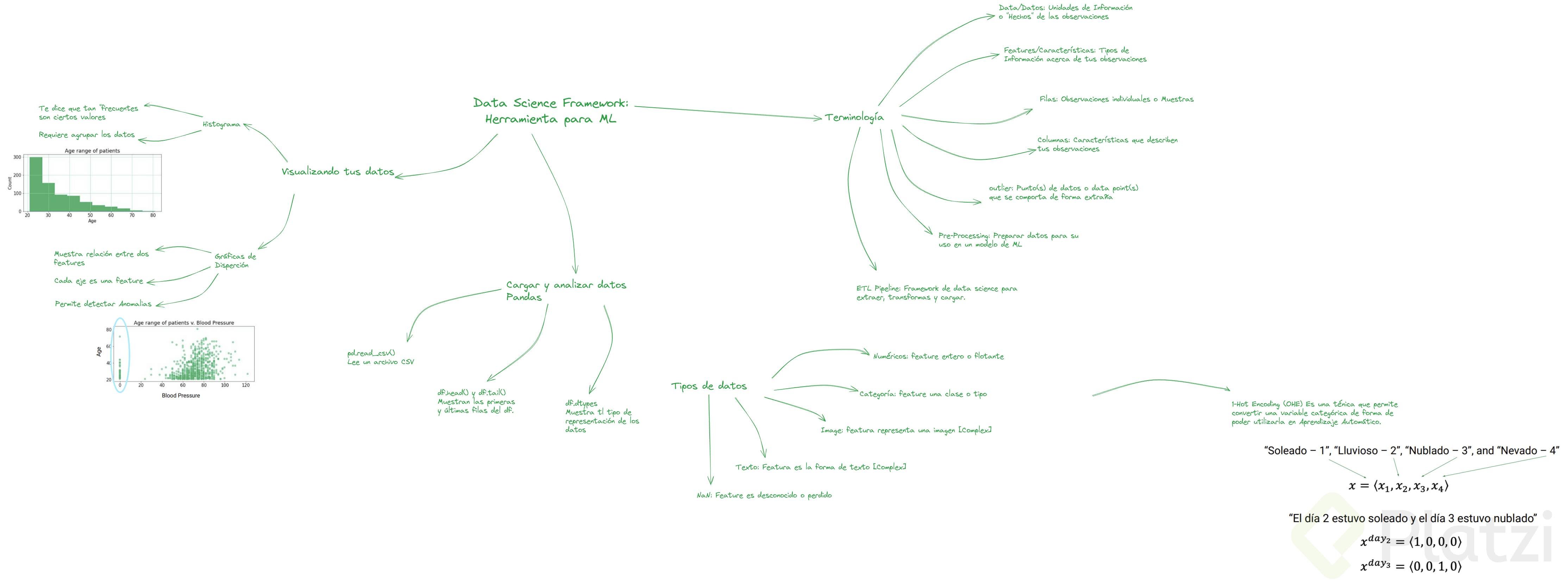 - Features: Son descriptores de las cualidades o propiedades de los datos, como altura, género o niveles de glucosa.