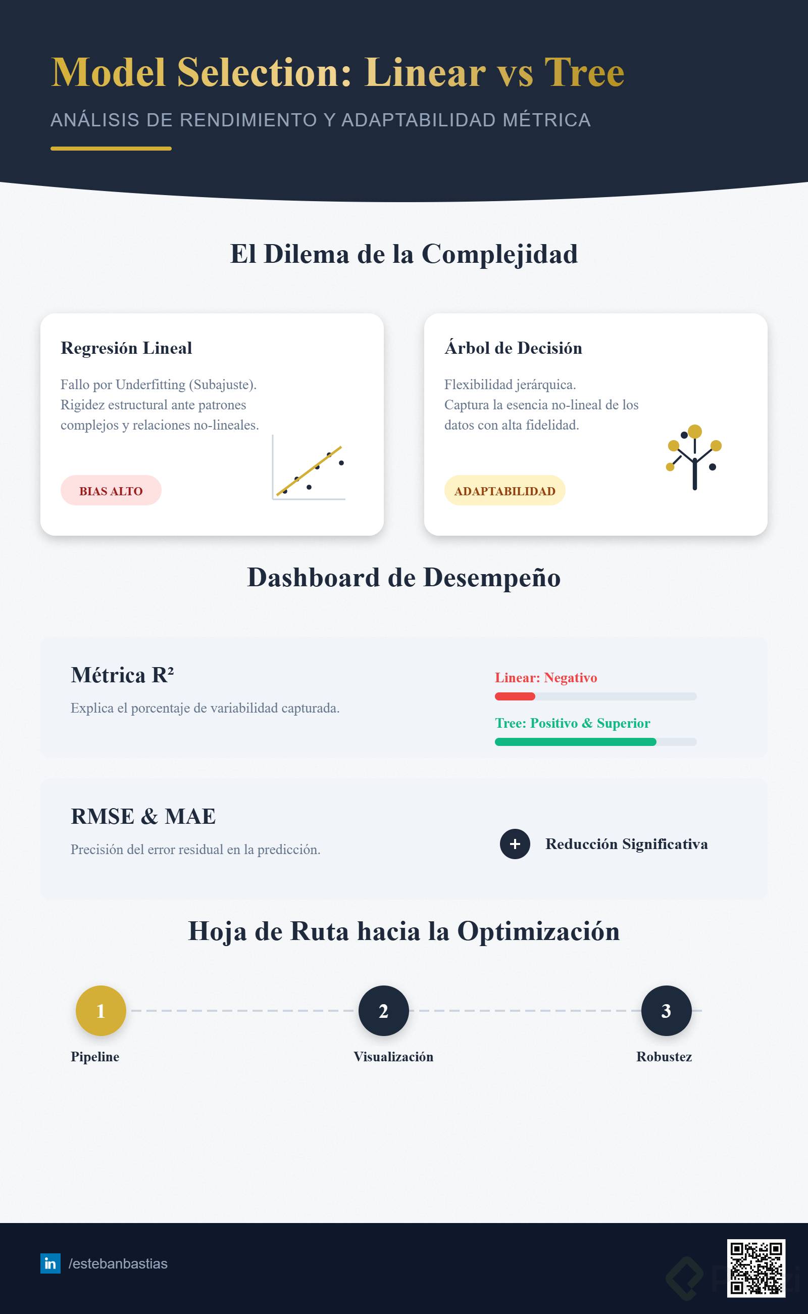 La elección adecuada de un modelo de predicción depende directamente de la naturaleza y comportamiento de nuestros datos. Al explorar la regresión lineal y el árbol de decisión, observamos diferencias significativas en sus resultados y métricas de desempeño. Analicemos juntos estos resultados y sepamos cuándo conviene seleccionar cada alternativa.