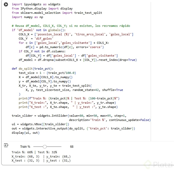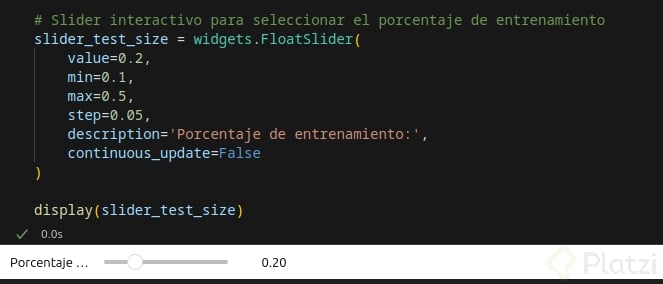 El uso de widgets interactivos en notebooks facilita la exploración dinámica de cómo afecta variar el tamaño de los conjuntos de datos separando entrenamiento y pruebas. Se implementa de siguiente forma: