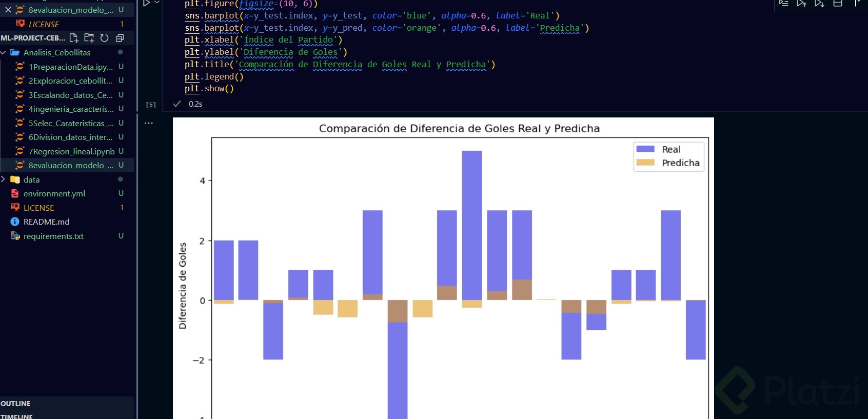 pandas,NumPyyscikit-learn. - Se define claramente la variable objetivo (por ejemplo, diferencia de goles) y las variables de entrada (tiros al arco, posesión del balón).