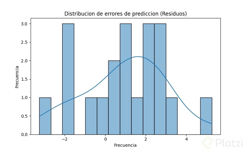 Finalmente, se realiza un análisis visual mediante un histograma de residuos, el cual permite detectar rápidamente sesgos o problemas específicos del modelo, determinando si tiende a sobreestimar o subestimar de manera constante.