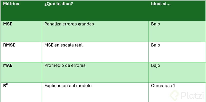 - Raíz del Error Cuadrático Medio (RMSE): devuelve el error a la escala original, facilitando la interpretación.