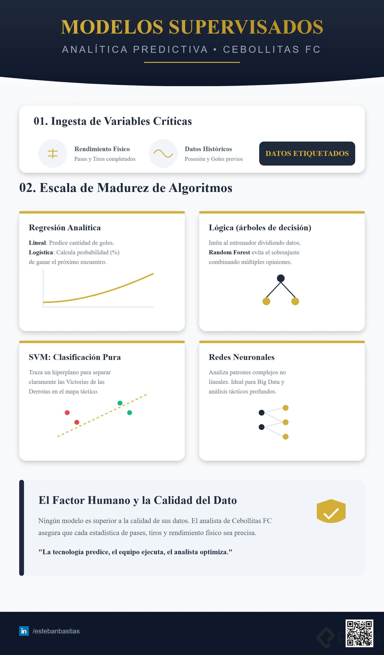 Todo modelo supervisado necesita datos etiquetados y precisos para funcionar correctamente. Aquí entra el papel fundamental del analista en equipos como Cebollitas FC, asegurando la calidad y precisión de cada dato para optimizar al máximo las predicciones del modelo.