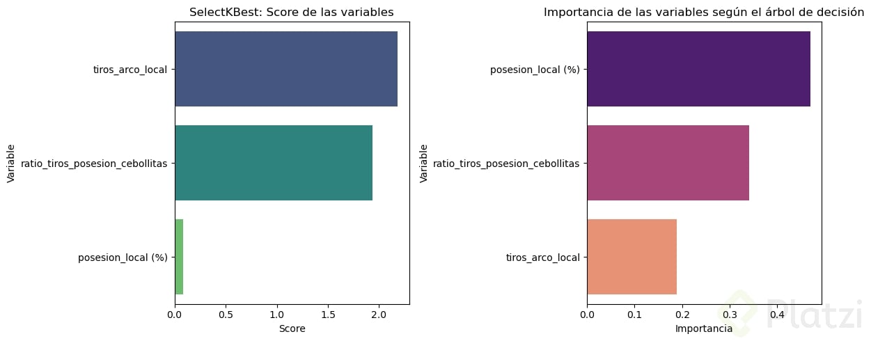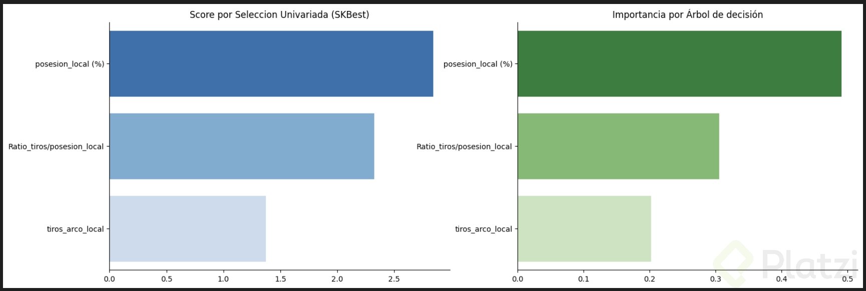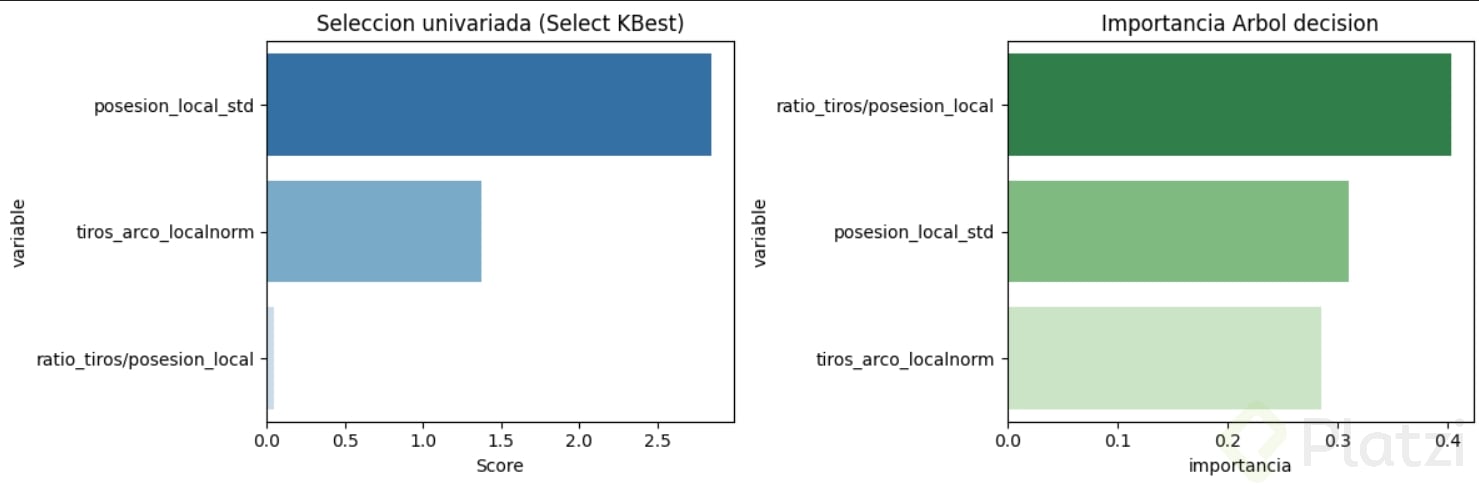 Ambas técnicas, selección univariada y árboles de decisión, proporcionan perspectivas diferentes pero complementarias. Al realizar una visualización comparativa gráfica con barras, queda en evidencia: