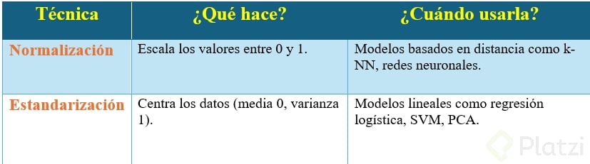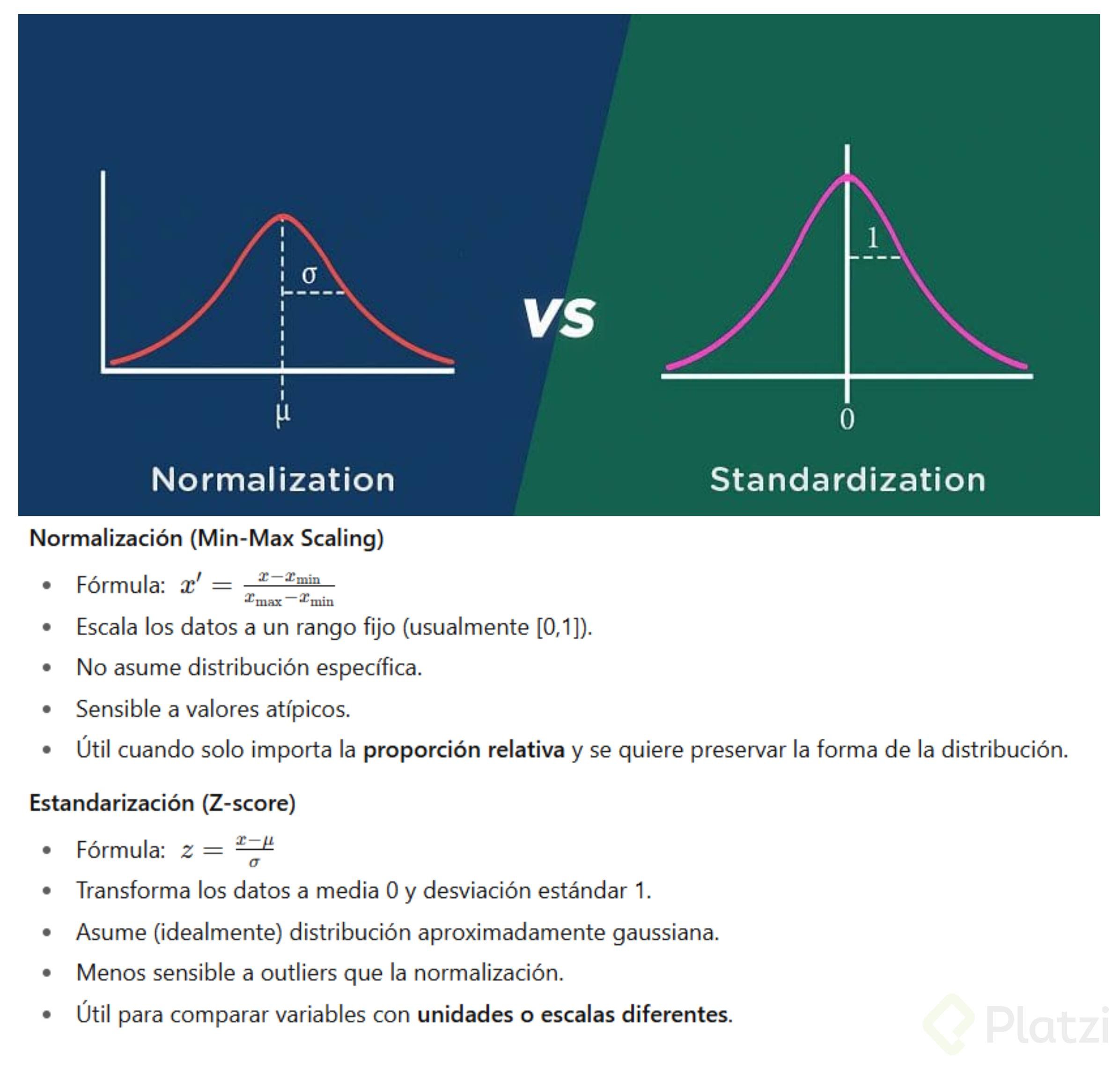 - Standard Scaler (Estandarización): reescala variables para tener una media de cero y desviación estándar de uno.