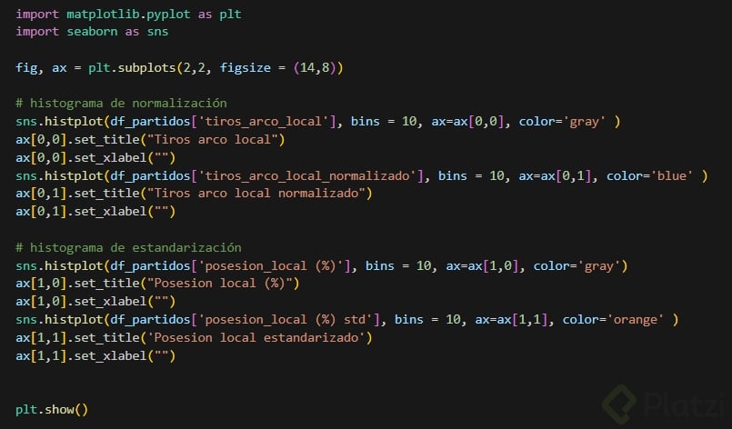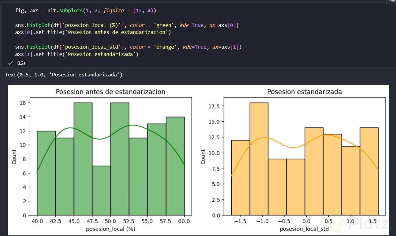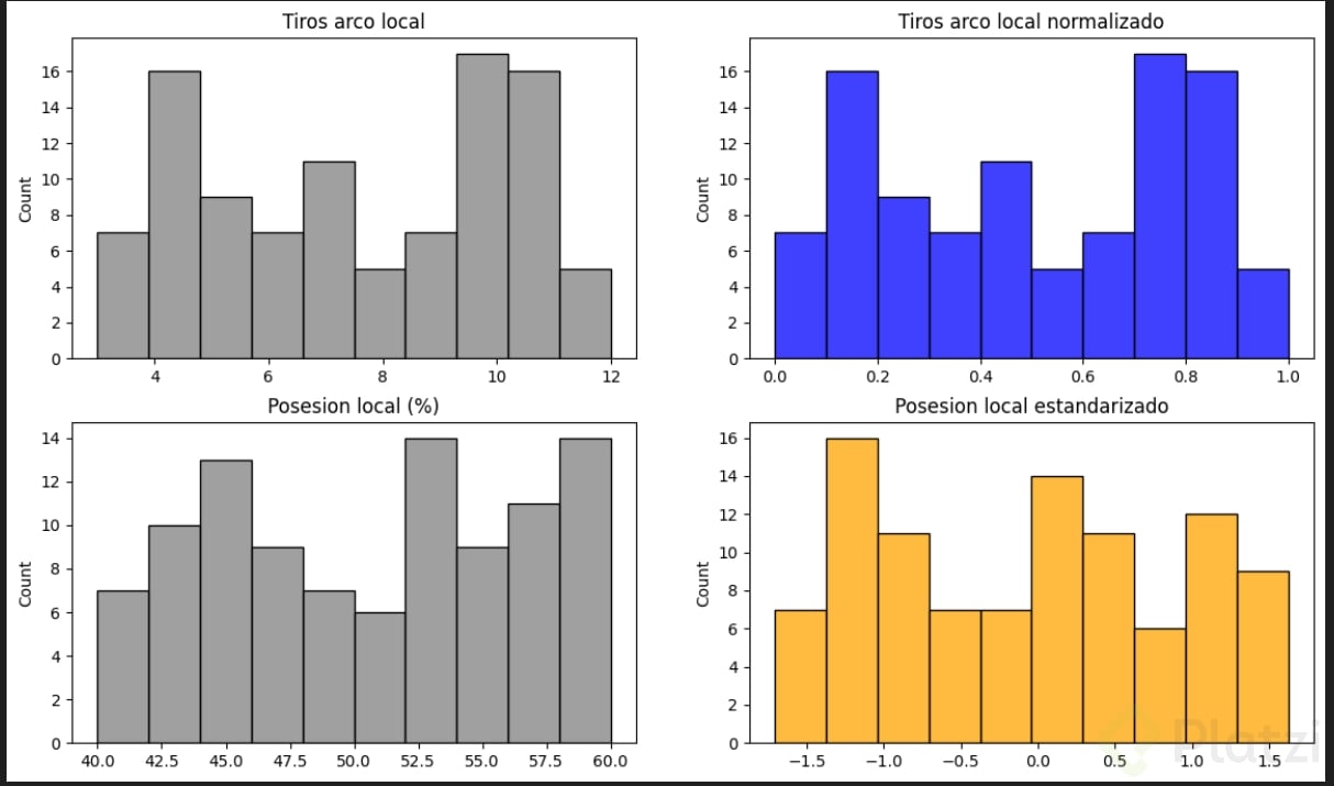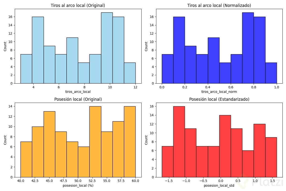 MatplotlibySeabornpara generar visualizaciones claras y atractivas. - Observa cómo se distribuyen tus datos normalizados y estandarizados mediante histogramas paralelos.