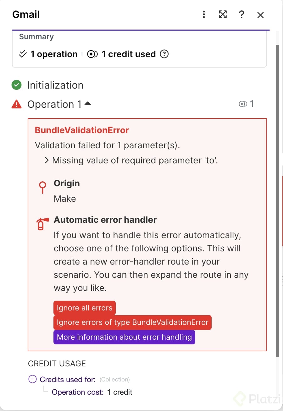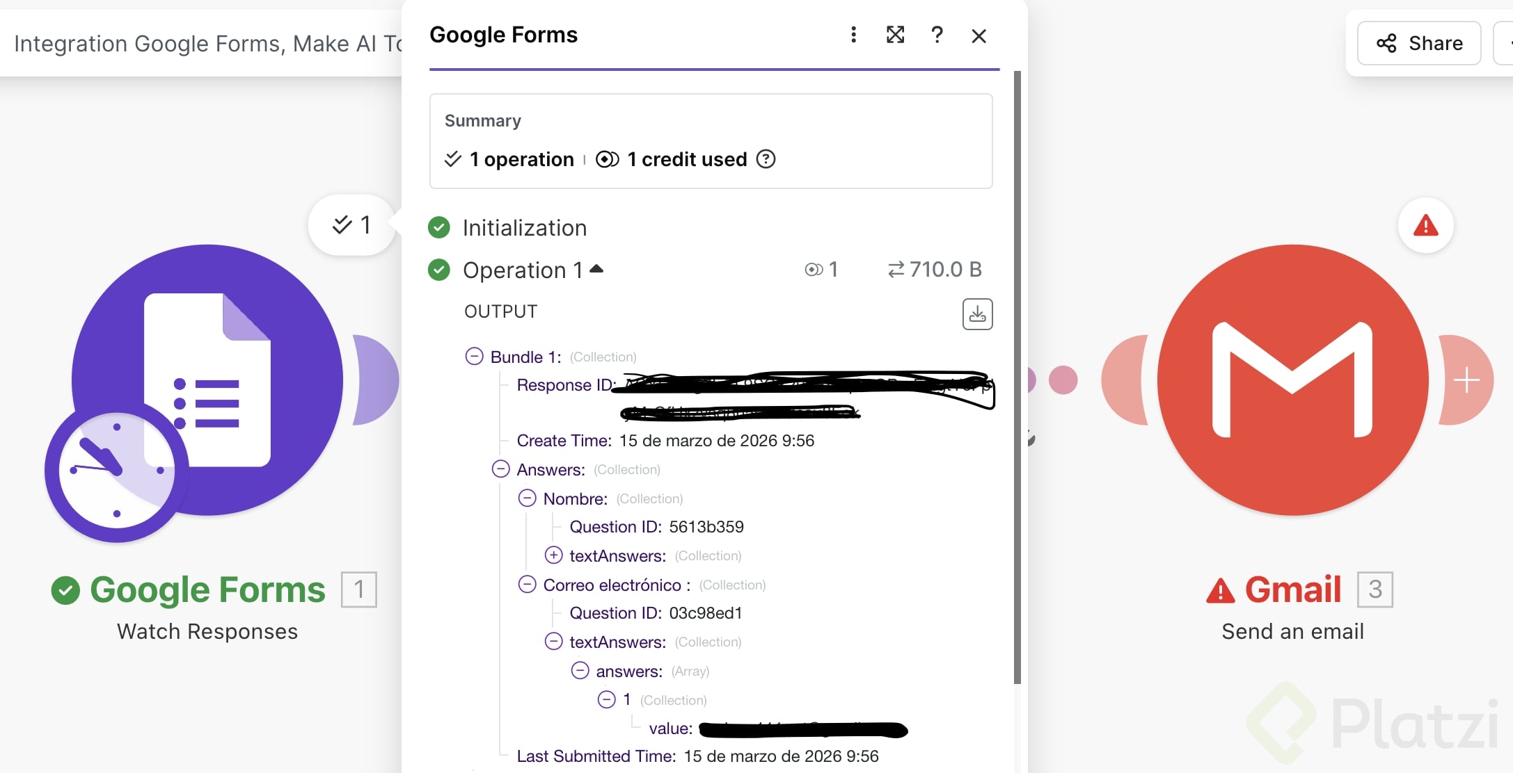 Profe, para solucionar mi problema me di cuenta que hay que cargar el forms a la misma carpeta de drive para que reconozca en el modulo 1 (google forms) el output (respondent email) y de esa manera corre el flujo entero sin errores