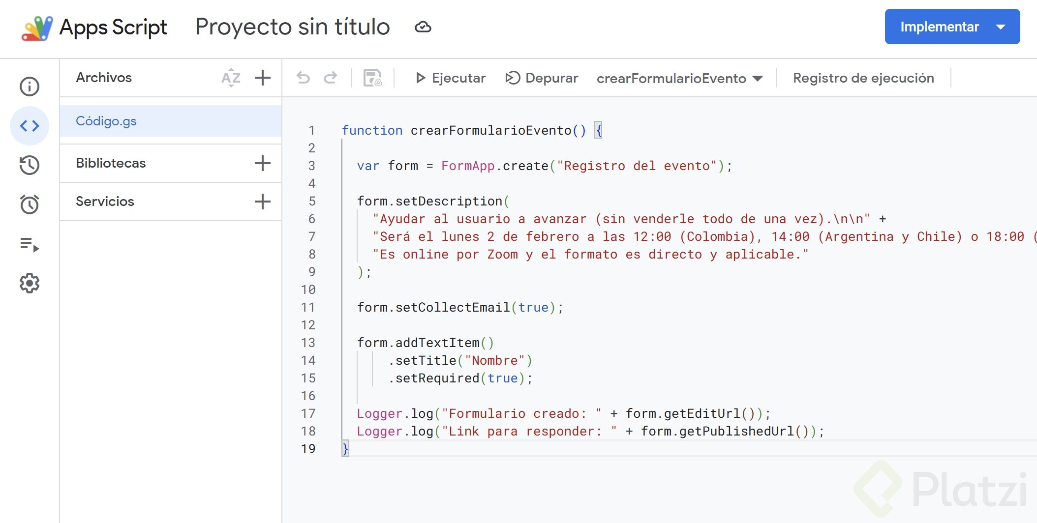 function crearFormularioEvento() { var form = FormApp.create("Registro del evento"); form.setDescription( "Ayudar al usuario a avanzar (sin venderle todo de una vez).\n\n" + "Será el lunes 2 de febrero a las 12:00 (Colombia), 14:00 (Argentina y Chile) o 18:00 (España). " + "Es online por Zoom y el formato es directo y aplicable." ); form.setCollectEmail(true); form.addTextItem() .setTitle("Nombre") .setRequired(true); Logger.log("Formulario creado: " + form.getEditUrl()); Logger.log("Link para responder: " + form.getPublishedUrl()); }