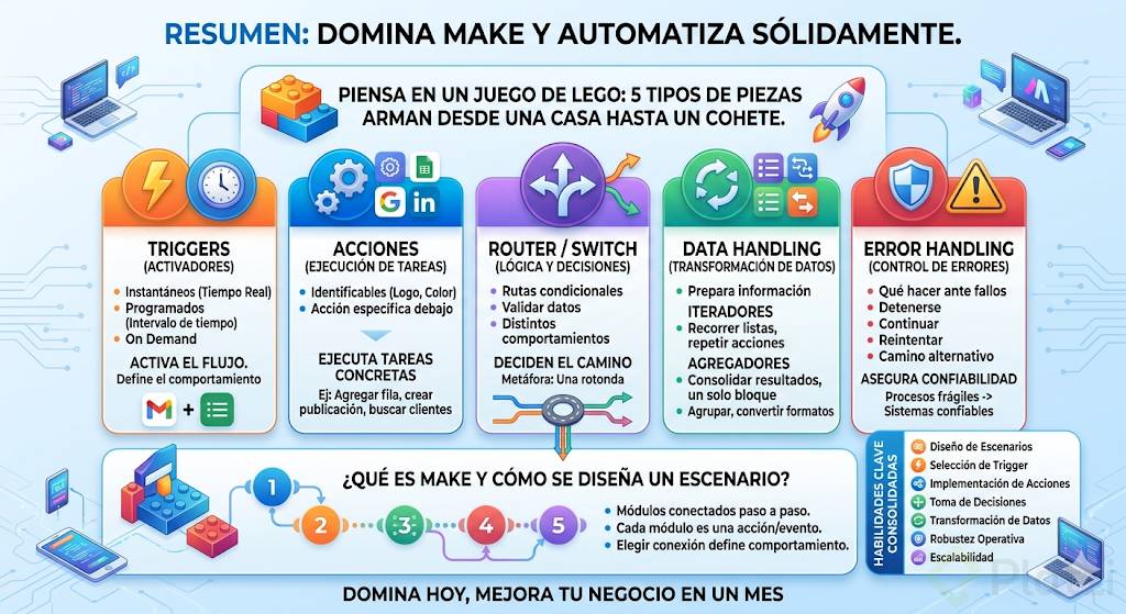 Domina en poco tiempo cómo construir automatizaciones sólidas y escalables en Make entendiendo sus cinco tipos de módulos. Un trigger activa el flujo, las acciones ejecutan tareas, router y switch deciden el camino, el manejo de datos transforma información con iteradores y agregadores, y el control de errores convierte procesos frágiles en sistemas confiables.