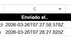 - Columna C “enviado el”: inserta la función de fecha y hora now.