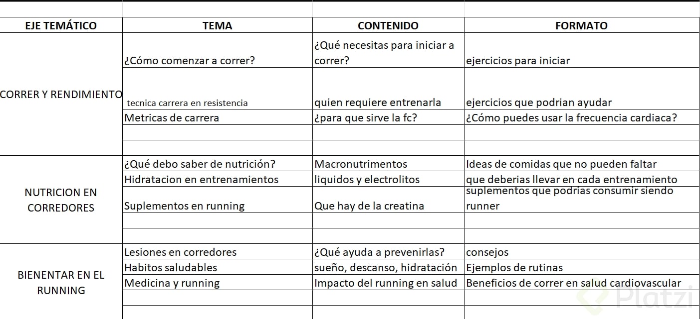 Ahora te toca a ti elaborar tu cuadro de ejes temáticos en función a tus objetivos y público objetivo. Sigue los pasos del ejemplo anterior.