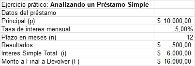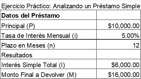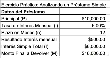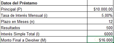 Datos: capital = 10,000 pesos, tasa = 5 % mensual, plazo = 6 meses. Se multiplican los tres: 10,000 × 0.05 × 6 = 3,000 pesos de intereses. El pago total al final del periodo es 13,000 pesos (10,000 + 3,000).