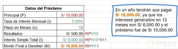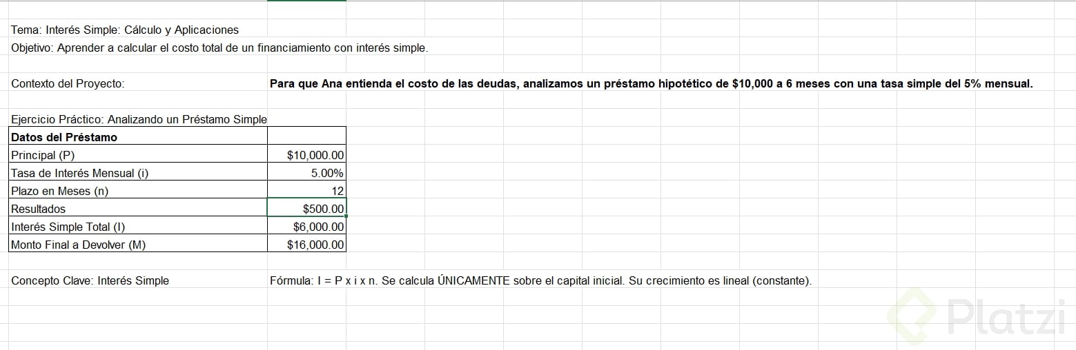 - Intereses totales en 6 meses: 500 × 6 = 3,000 pesos.
