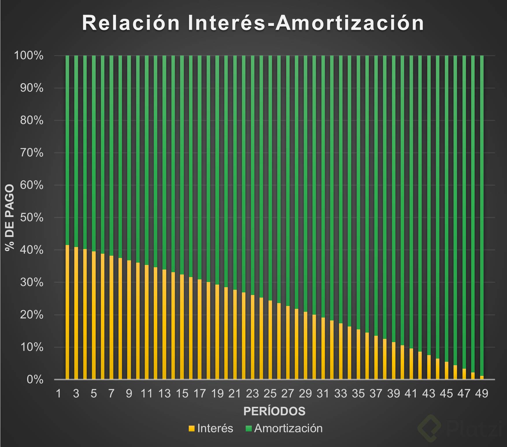 Observa el patrón: los intereses decrecen paulatinamente porque el saldo pendiente baja; la amortización aumenta en la misma medida.