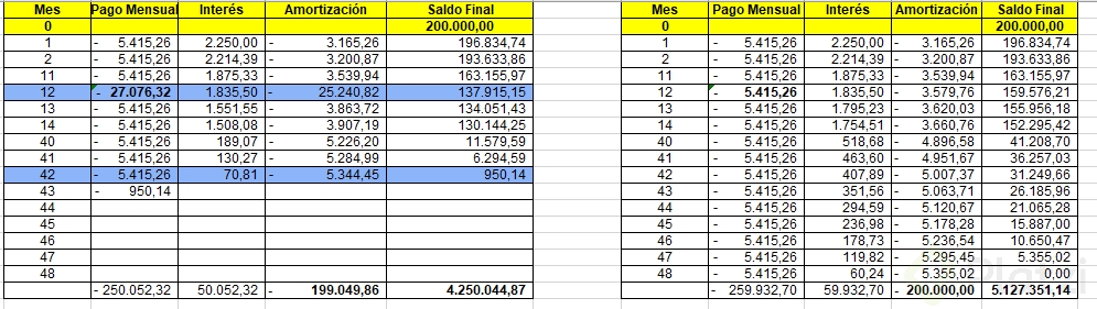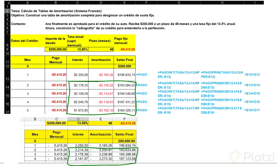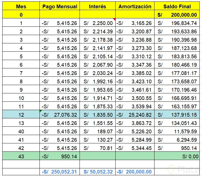 - Interés del periodo = saldo insoluto × Interés/12.