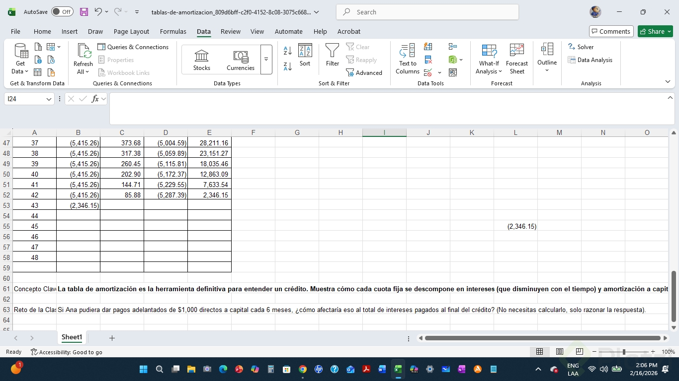 Reto práctico: si en el mes 12 se anticipan cinco pagos, ¿bajarían los intereses totales? ¿disminuiría el plazo? Comparte tus cálculos y comentarios.