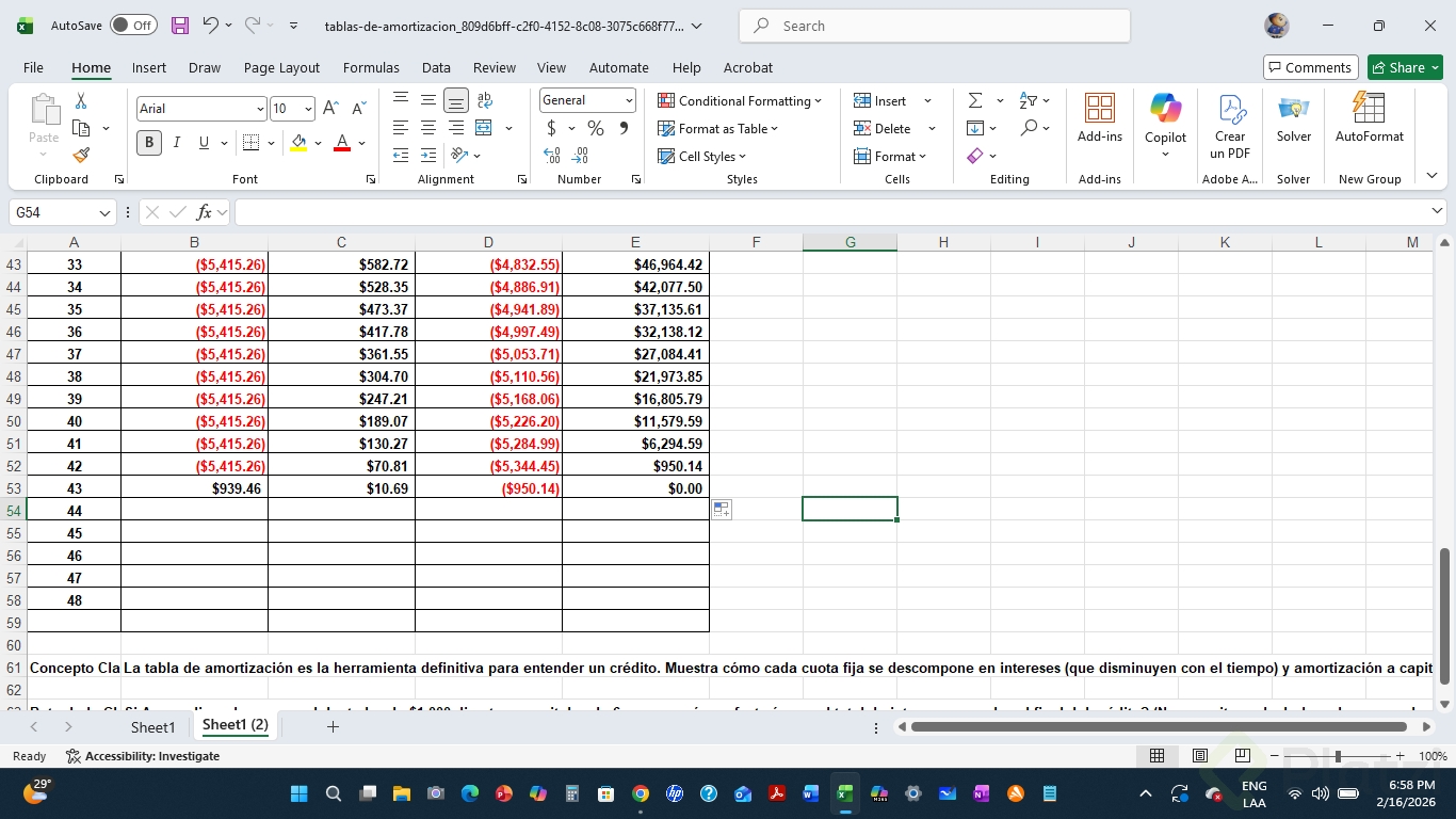 - Arrastrar fórmulas hasta el periodo 48 para completar la tabla.