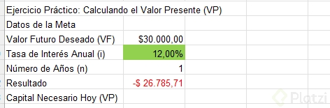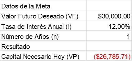 ¿Cómo calcular el valor presente en Excel para una meta de 30,000?