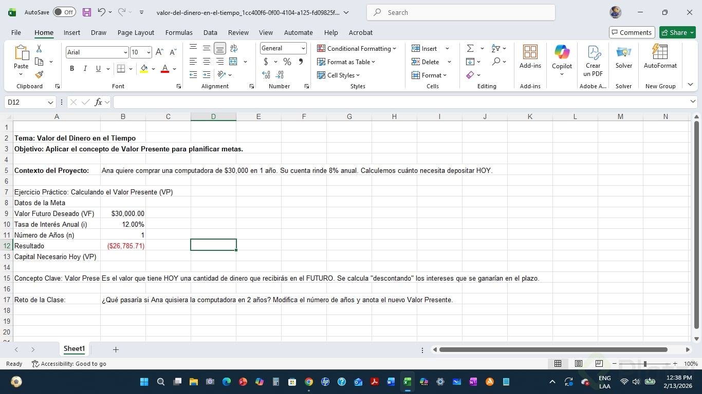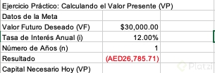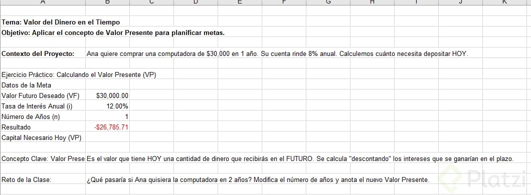 Ana quiere comprar una computadora cuyo valor futuro (VF) es de 30,000 pesos dentro de un año. Invertirá en un banco al 8 % de interés anual. El reto: hallar el valor presente (VA), es decir, cuánto debe depositar hoy.