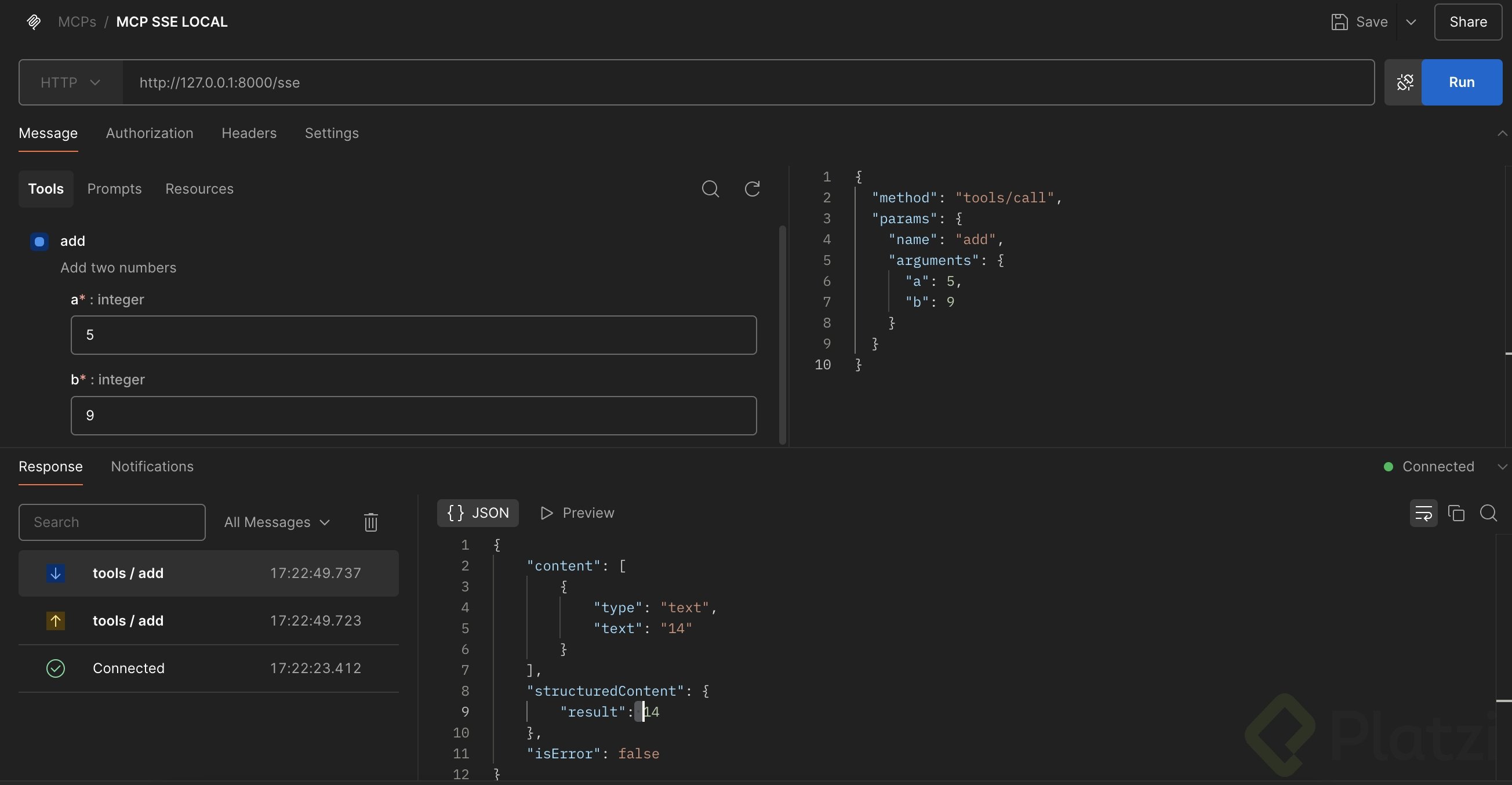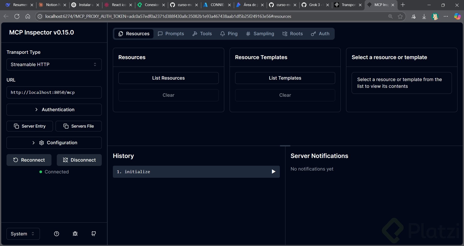 La conexión al inspector sigue siendo igual, solo cambiando el transporte de STDIO a SSE al especificar la URL señalada. Esta pequeña modificación hará más eficiente el intercambio de información sin cambios visibles en la interfaz del usuario.