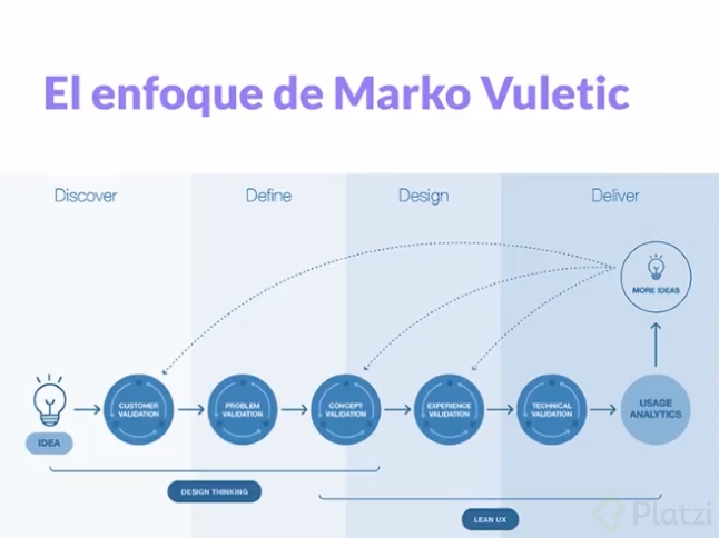 Por otro lado, Marko Vuletic propone un enfoque de combinación de metodologías. Por ejemplo, fusiona lo mejor del Design Thinking con lo mejor del Lean UX.