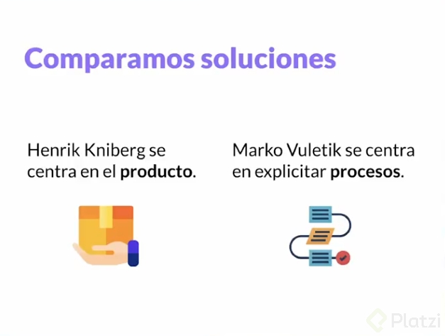 | Henrik Kniberg | Marko Vuletik | | --- | --- | | Se centra en el producto.| Se centra en explicitar procesos. |