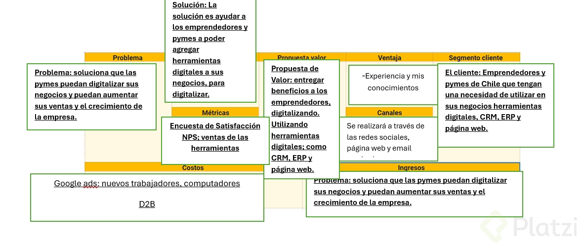 Revisa nuevamente tu Lean Canvas y con todo lo que has aprendido en las últimas clases vuelve a analizar los nueve elementos que componen esta herramienta y con tus actuales conocimientos detalla y define si mantienes tu modelo o deseas adaptarlo a los nuevos modelos de negocio aprendidos.