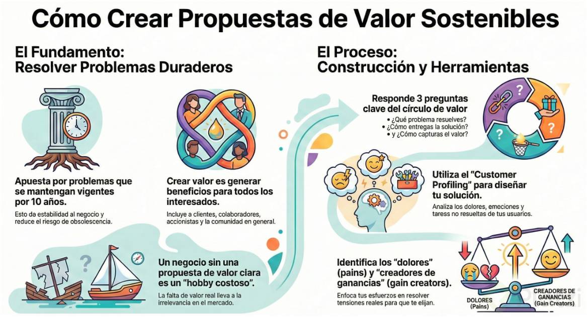 La creación de valor implica generar beneficios tangibles para todas las partes interesadas: clientes, colaboradores, accionistas y la comunidad. Un negocio sin una propuesta de valor clara suele caer en la irrelevancia y se convierte en un "hobby costoso".