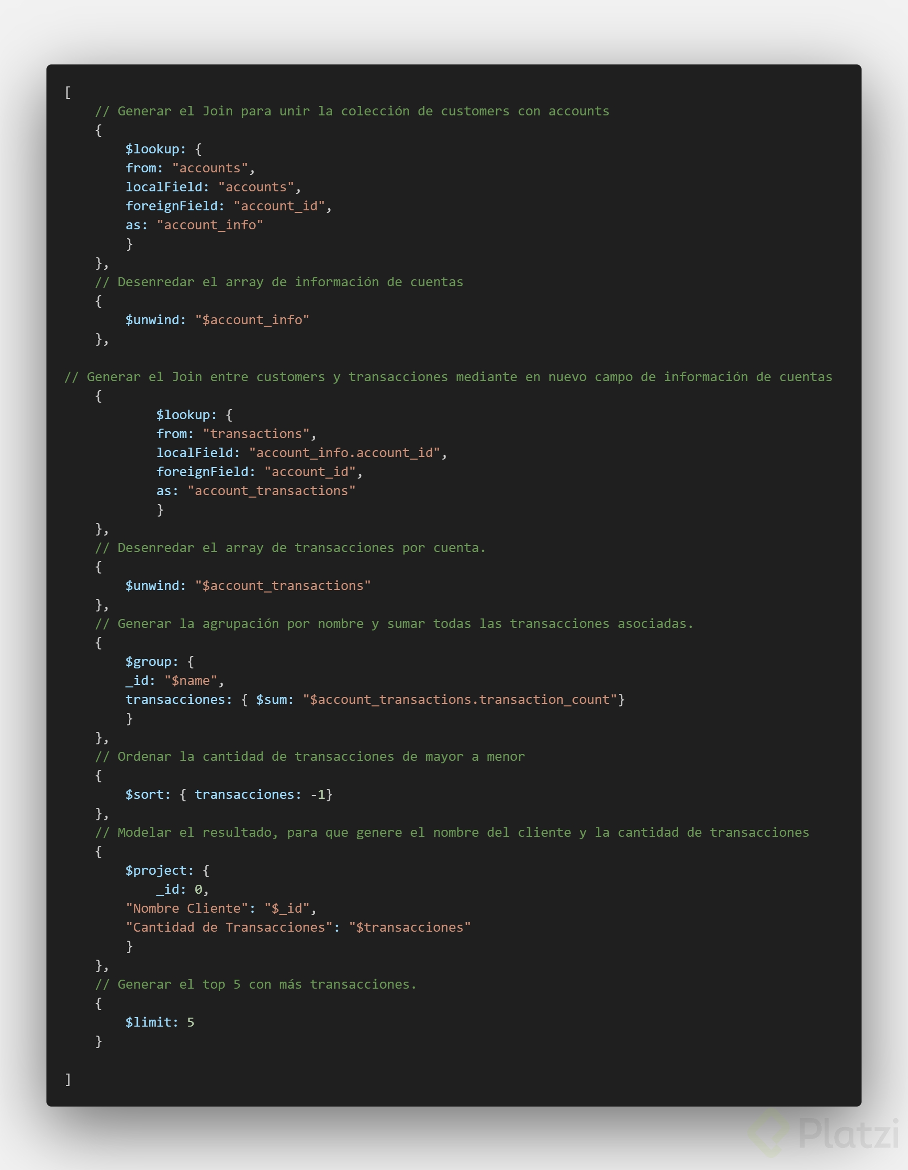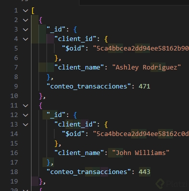 Finalmente, usamos $project para formatear cómo queremos que se presenten los resultados, enfocándonos en el nombre del cliente y el total de transacciones: