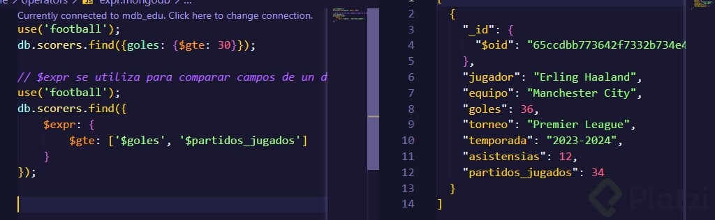En este ejemplo, el operador $expr y $gt (greater than) permiten comparar el campo spent con el campo budget dentro del mismo documento. Esto devuelve los documentos donde el gasto (spent) ha superado el presupuesto (budget).