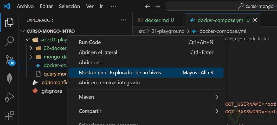 Para configurar un contenedor de MongoDB en Docker, necesitas crear un archivo docker-compose.yaml. Este archivo describe cómo se levantará el contenedor de MongoDB y se detalla en el siguiente código: