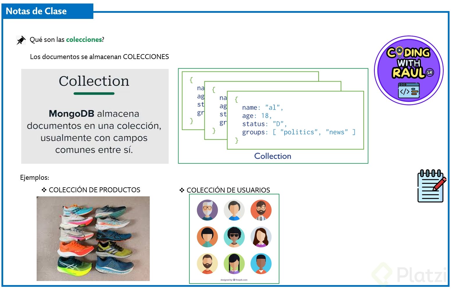Las colecciones organizan documentos que guardan datos relacionados. Por ejemplo, en un sistema de comercio electrónico, podrías tener colecciones separadas para "productos" y "usuarios". Cada colección almacena múltiples documentos que representan instancias individuales de esos productos o usuarios: