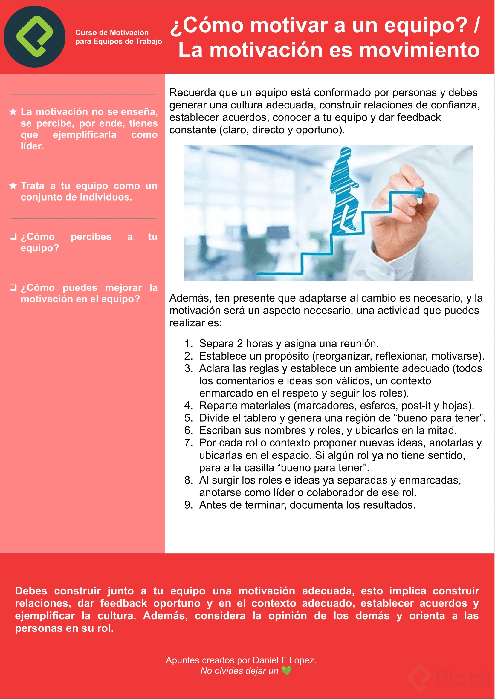 El éxito es un proceso. El trabajo en equipo también lo es, al igual que la motivación. Por tal, para conseguirlo, consta de unas acciones que deben de iterarse orgánicamente para convertirse en parte de la cultura organizacional de la empresa en la que trabajas.