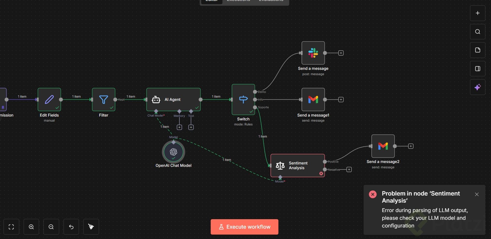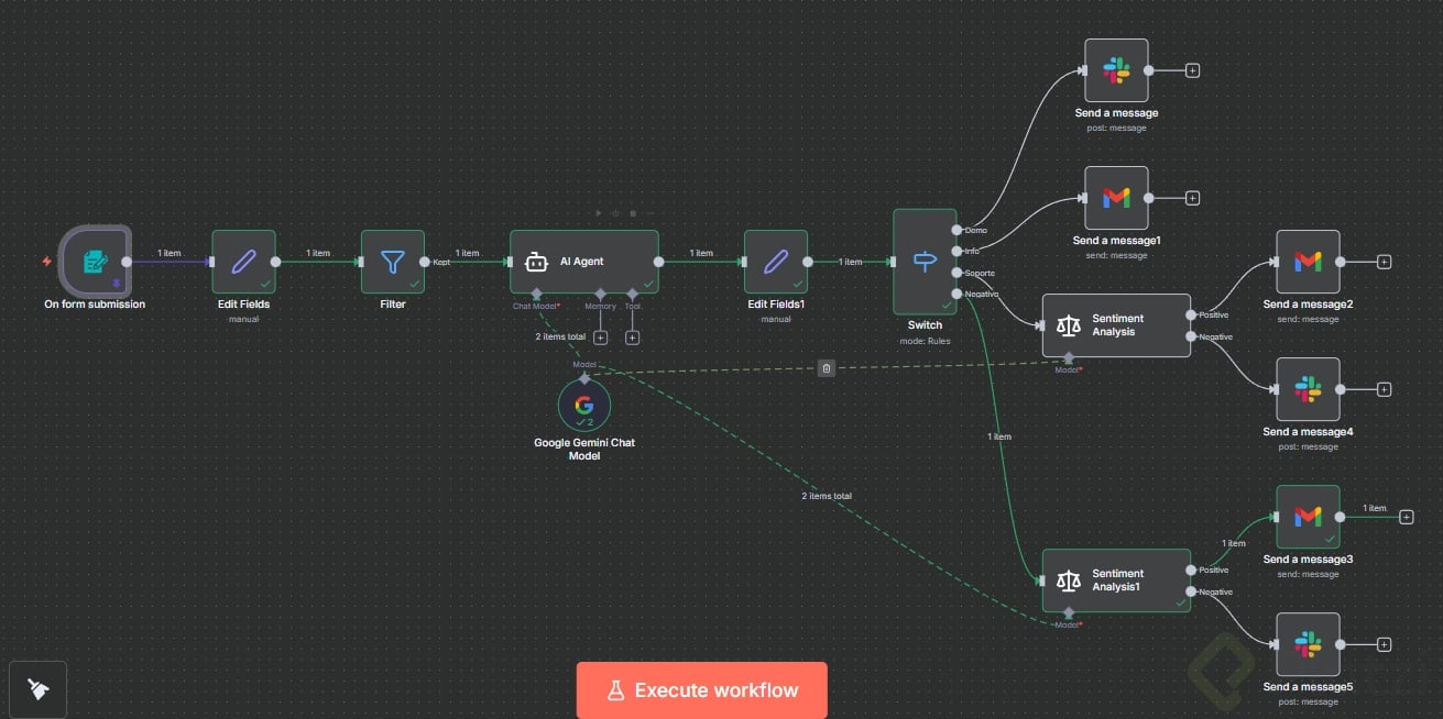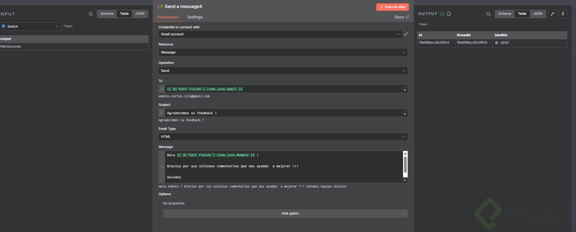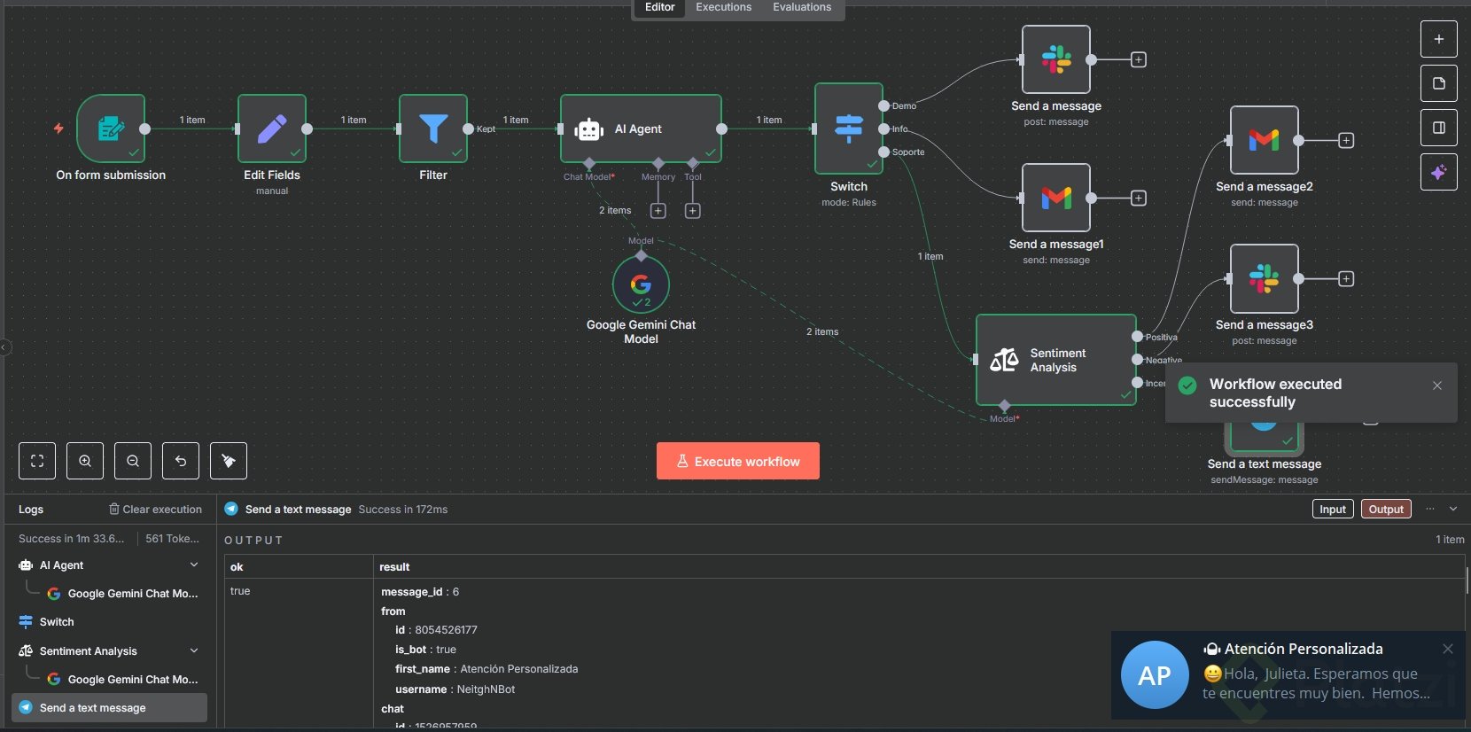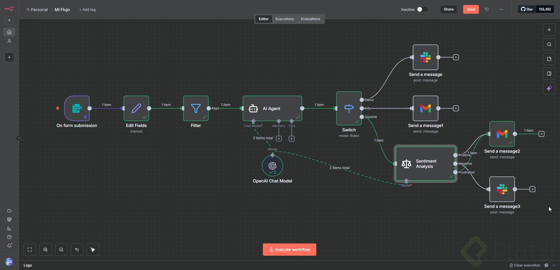 - Ruteo condicional: ramas positiva/negativa activan Slack o Gmail según el caso.