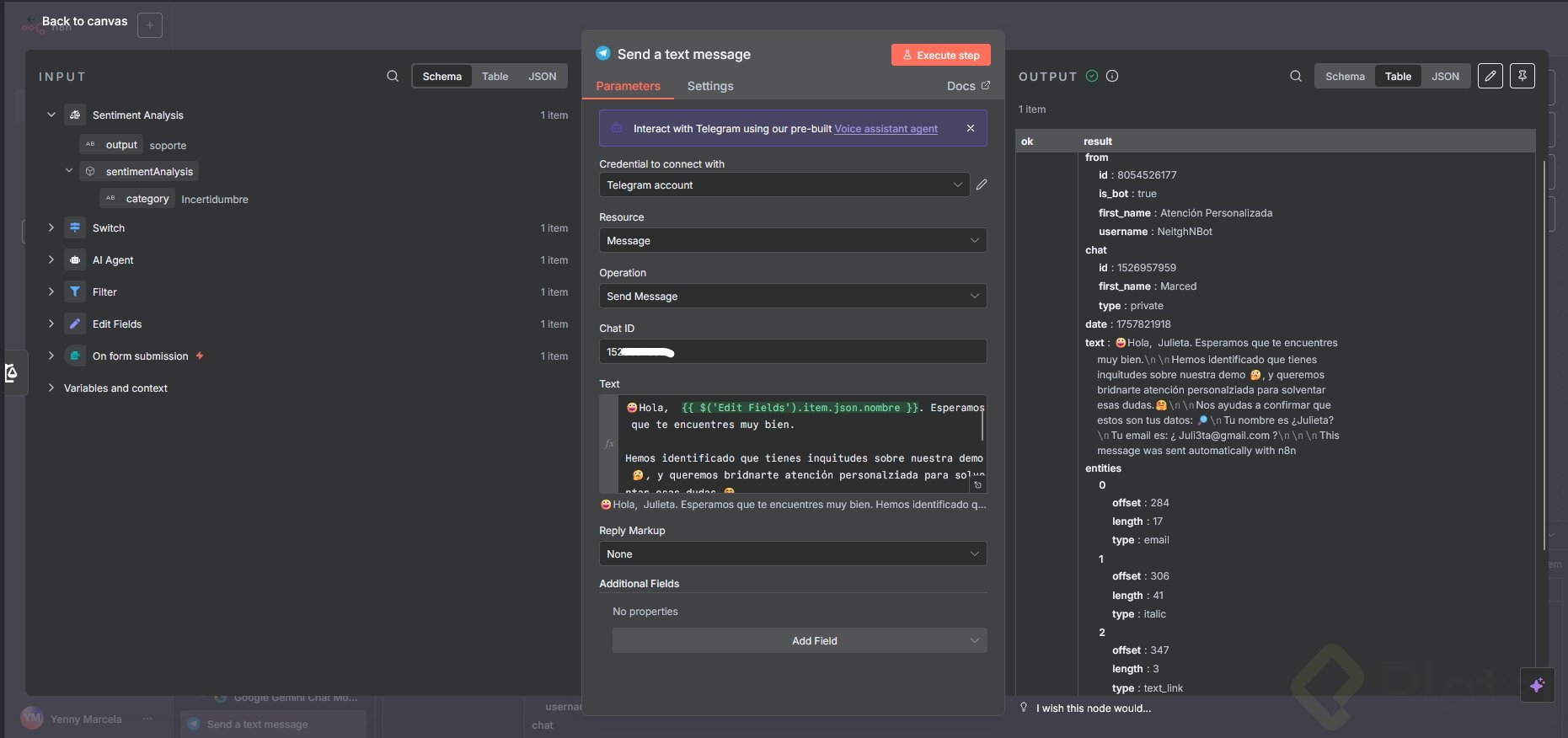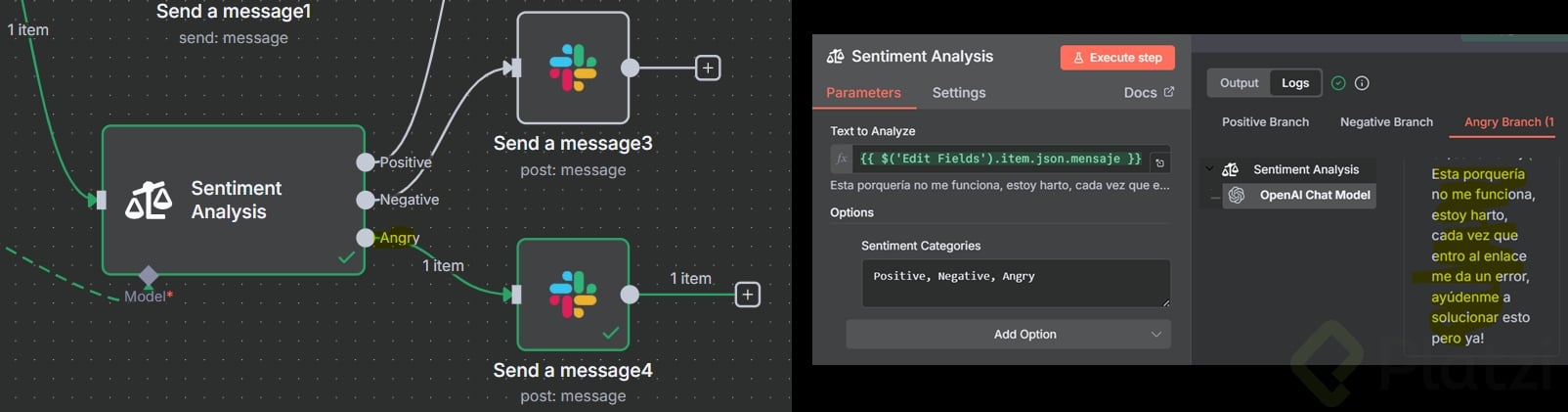Tras clasificar el sentimiento, el flujo se bifurca en dos ramas. Así decides qué canal usar según el estado emocional del cliente.