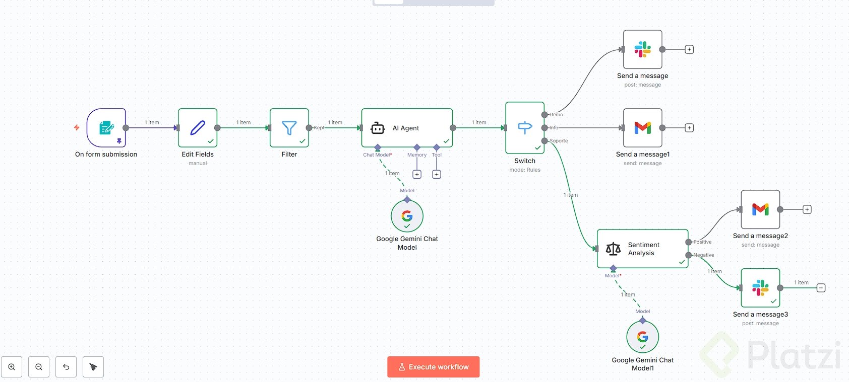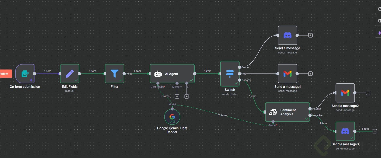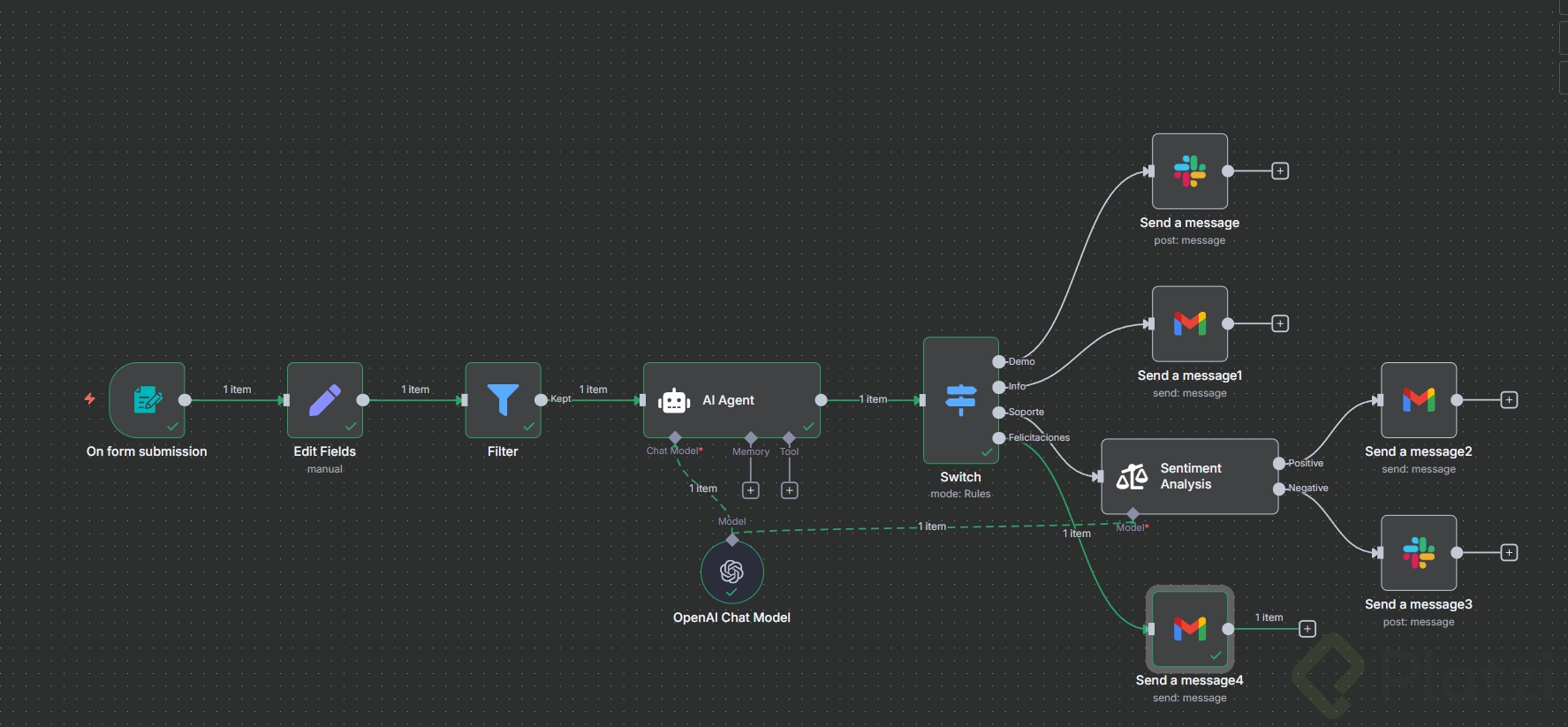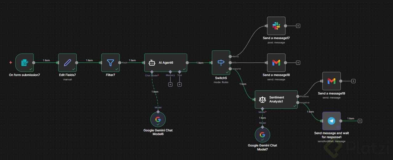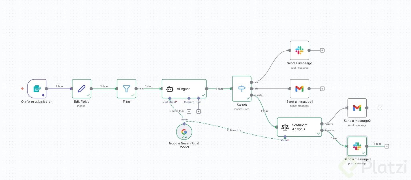 Con un flujo ya automatizado, el objetivo es insertar un nodo que clasifique el mensaje del formulario por sentimiento y active acciones distintas según el resultado.