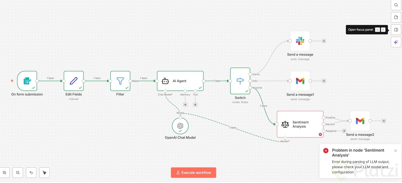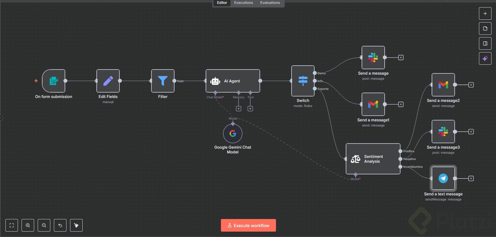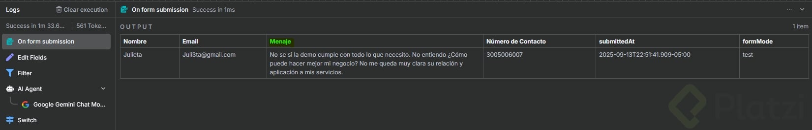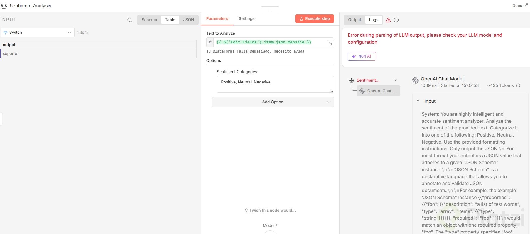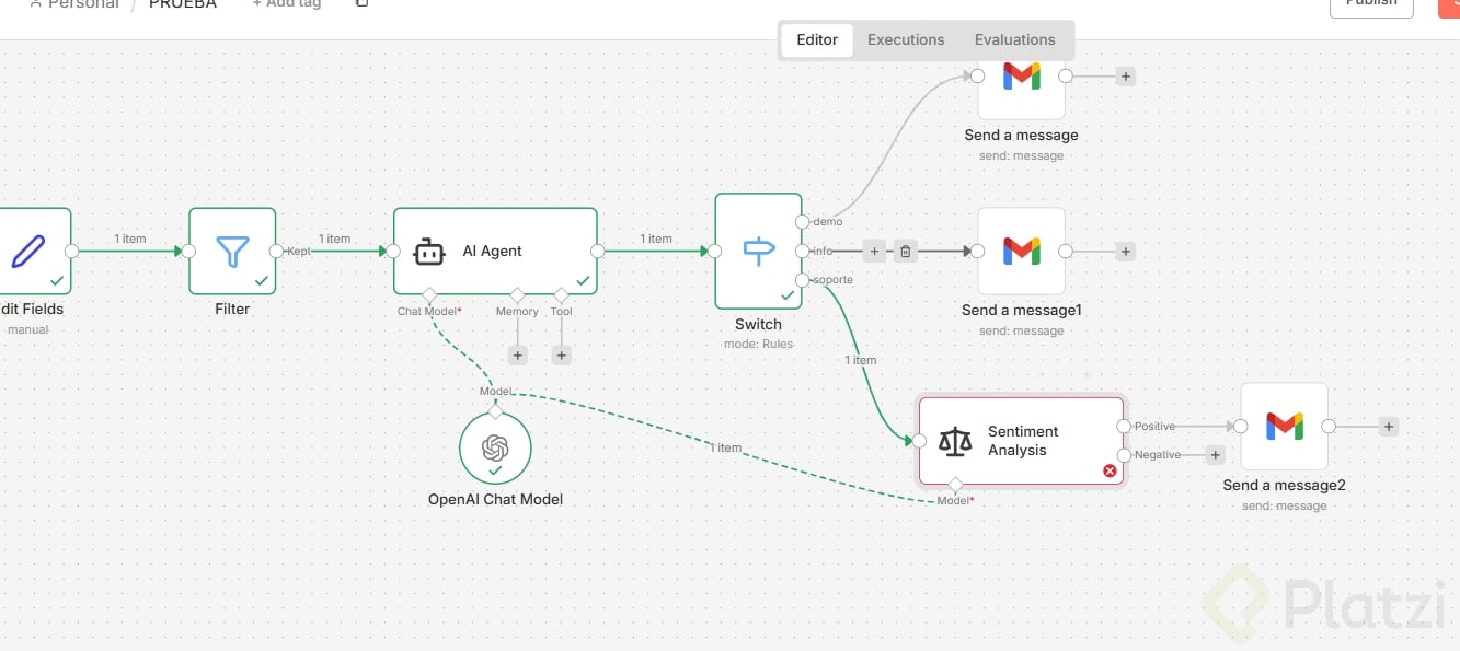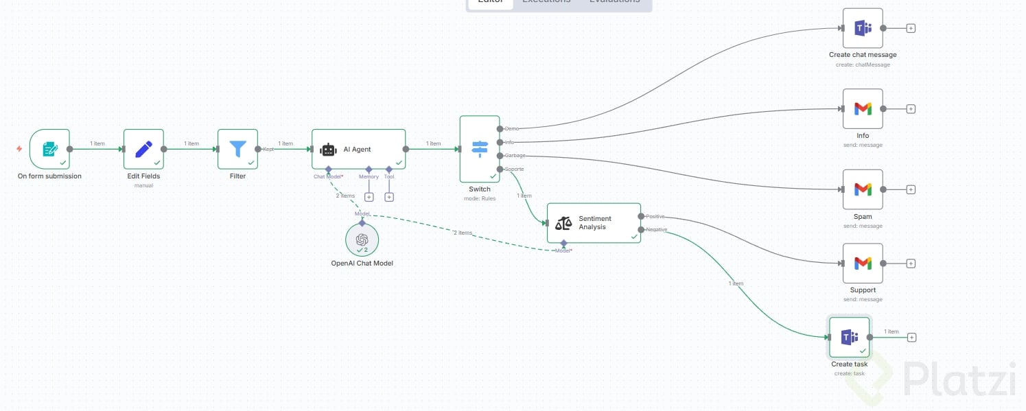 Con un flujo ya automatizado, el objetivo es insertar un nodo que clasifique el mensaje del formulario por sentimiento y active acciones distintas según el resultado.