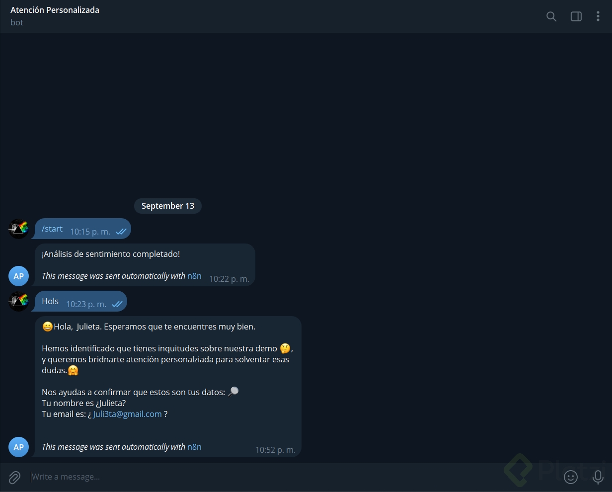 - Reutiliza variables previas: email, nombre y mensaje del cliente para contexto completo.
