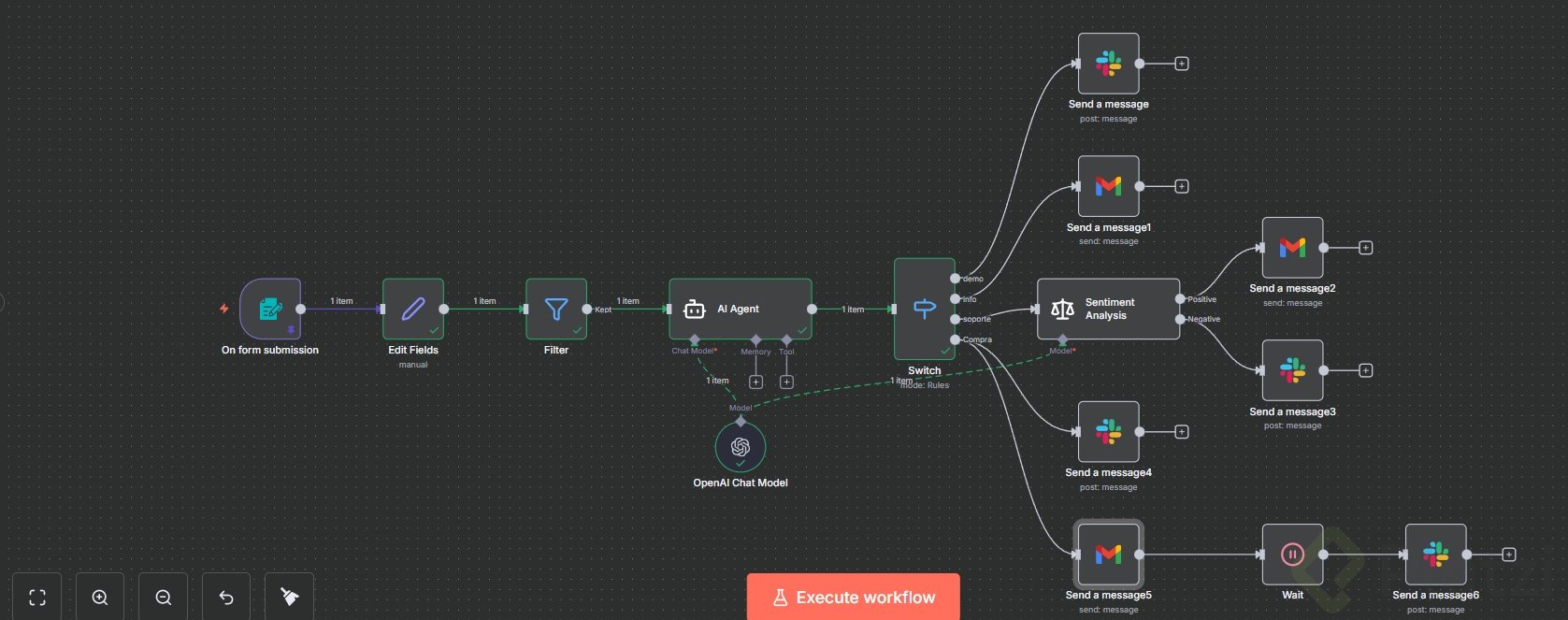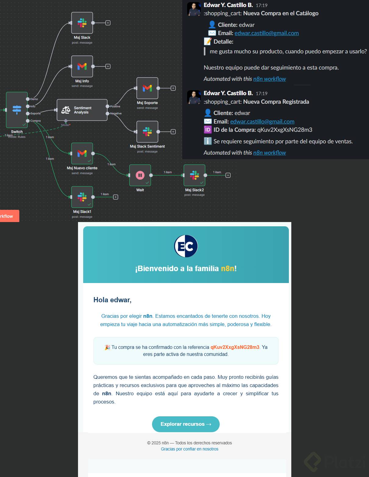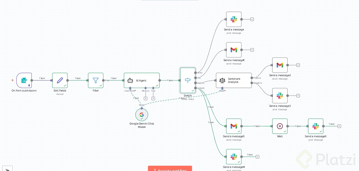 Ideas y habilidades que te llevas: - Clasificación por intención con AI agent y categoría “compra”. [00:00]. - Enrutamiento condicional con switch y add routing. [00:00]. - Reutilización de nodos con duplicar para acelerar la configuración. [00:00]. - Mensajería multicanal: Slack para equipo y Gmail para clientes. [00:00]. - Control de tiempos con nodo wait para programar seguimiento. [00:00]. - Pruebas y depuración con pin/unpin, Execute workflow, zoom y verificación visual del flujo. [00:00].