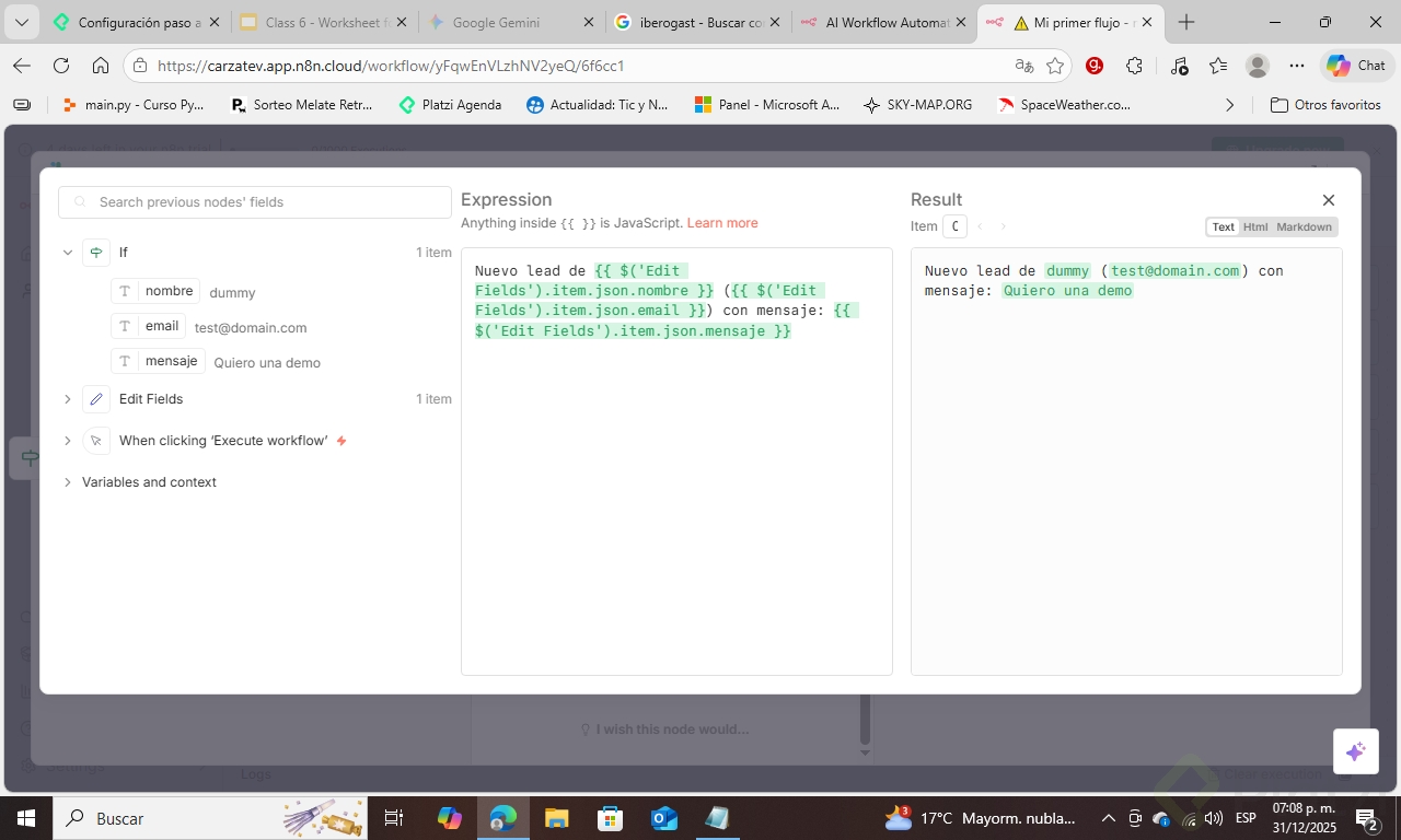 - Ejecuta con Execute workflow y verifica que el nodo set muestra el mensaje configurado. [00:00]