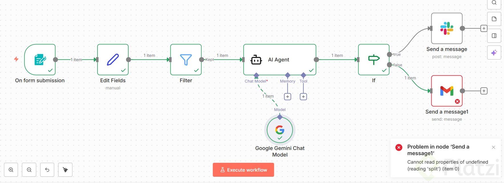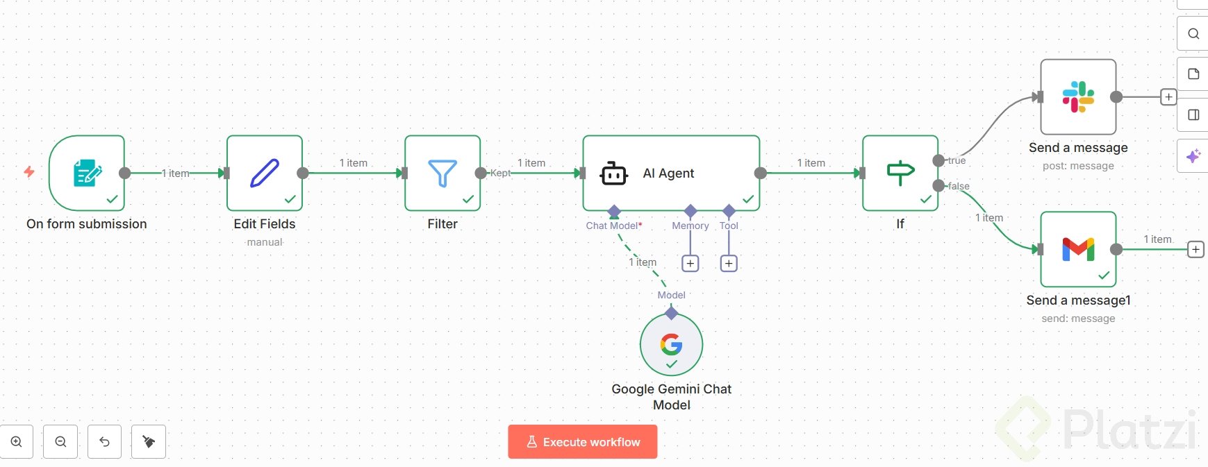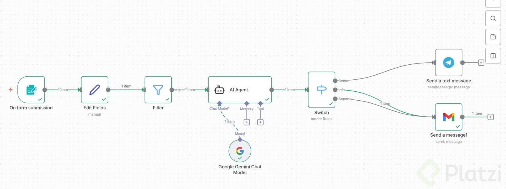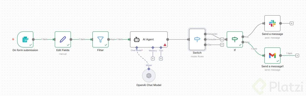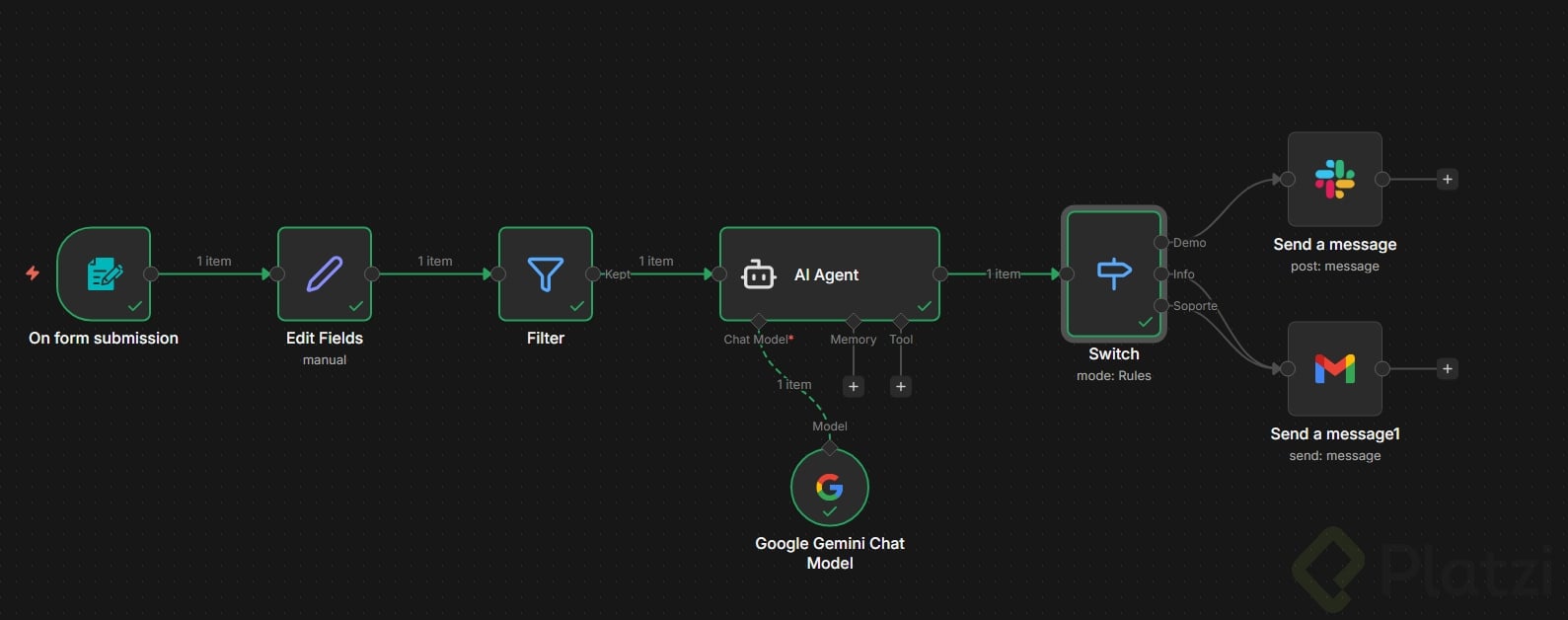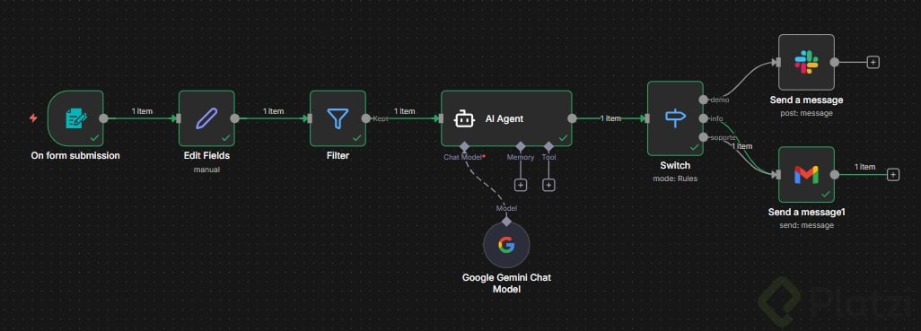 - Elimina el nodo if y conecta: demo → Slack; info/soporte → Gmail.