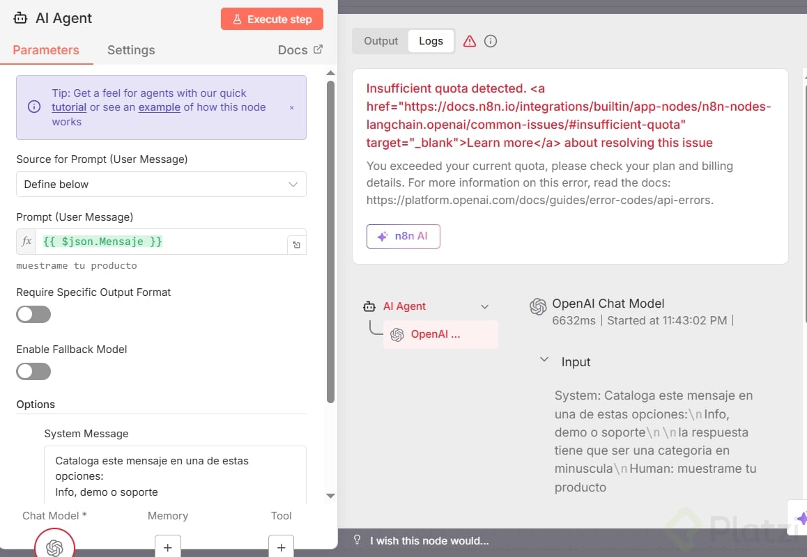 Ejecuta el workflow y usa mensajes naturales que impliquen intención.