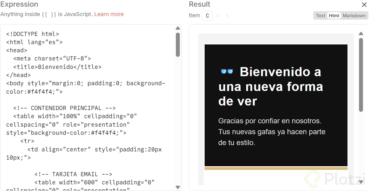 Para dar un salto de calidad, se usa ChatGPT para generar un “template” en HTML y CSS compatible con Gmail, dejando un espacio para insertar el cuerpo que generó la IA. En el nodo de correo, se pega la plantilla, se localiza “cuerpo principal” y se reemplaza por el output del agente. Se previsualiza a la derecha, se guarda y se testea con datos fijados en pin.