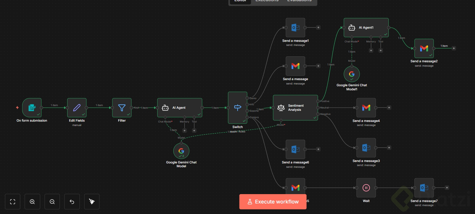- Ruta del flujo: positivo → correo personalizado; enfadado → equipo humano.
