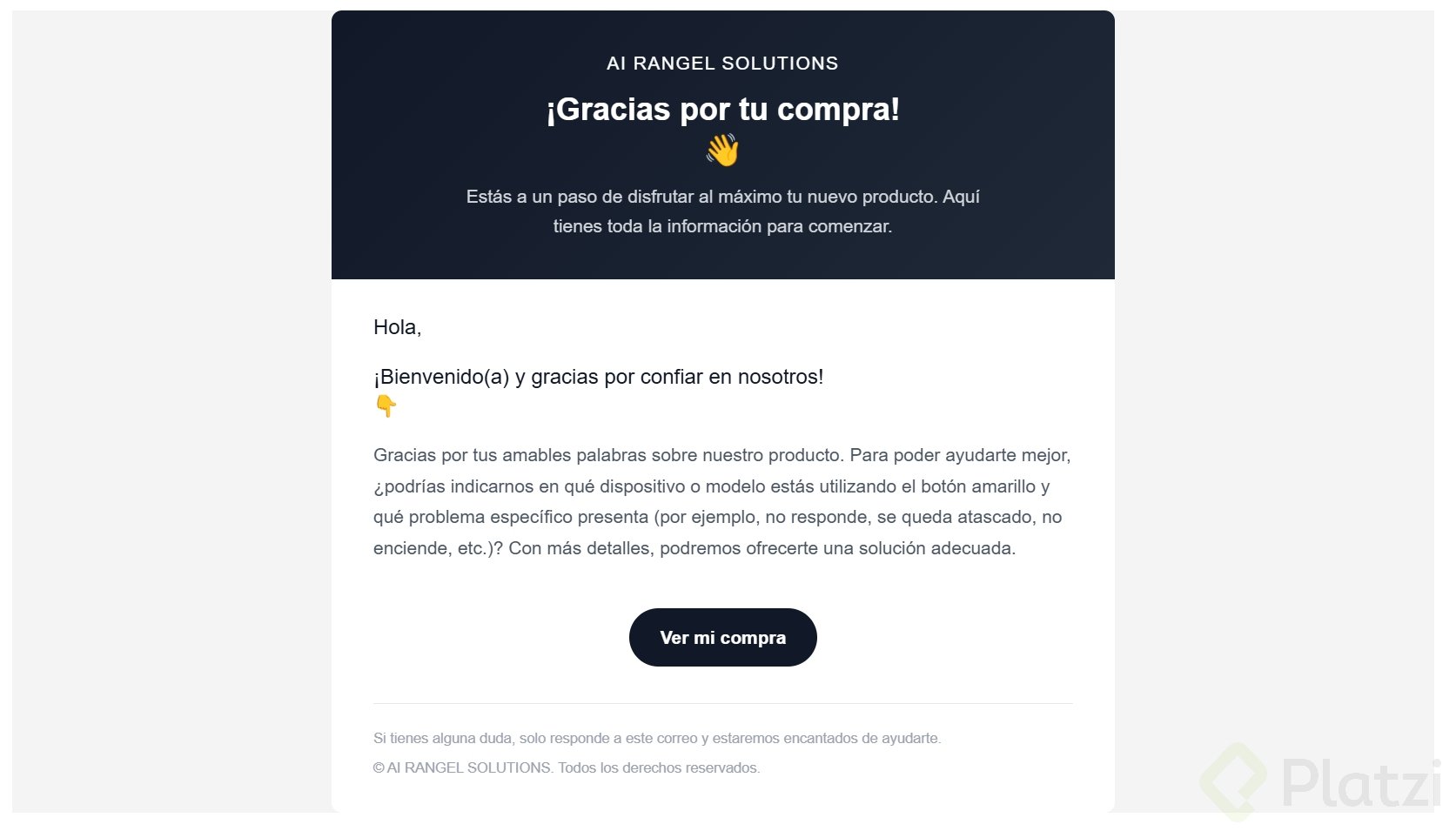 Cuando el cliente detalla su problema (“no me funciona el botón amarillo”), la IA responde de forma específica, por ejemplo sugiriendo reiniciar la máquina. Así se evita un correo genérico y se entrega una ayuda contextual.