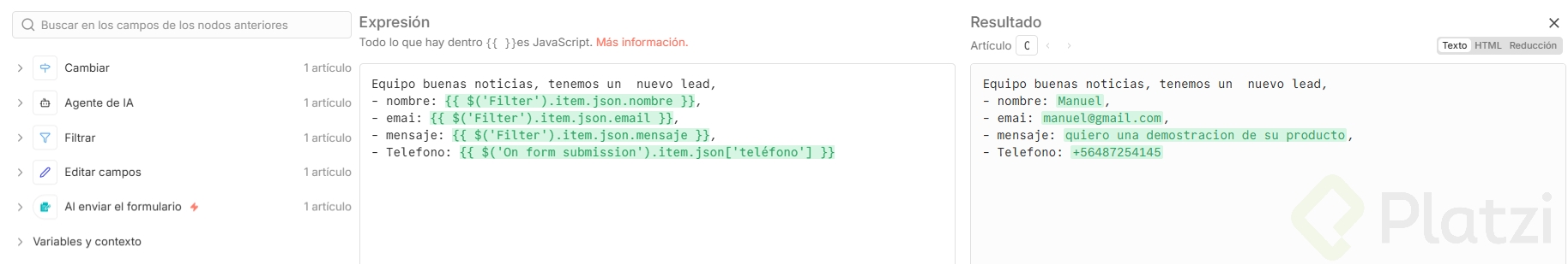 Trabajar con expresiones en N8N es la base para automatizar mensajes contextuales. Al arrastrar campos del nodo Edit Fields (nombre, email y mensaje) hacia el texto de Slack, puedes componer un aviso completo y legible para tu equipo, con saltos de línea y etiquetas.