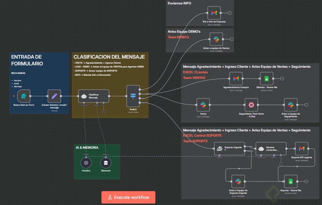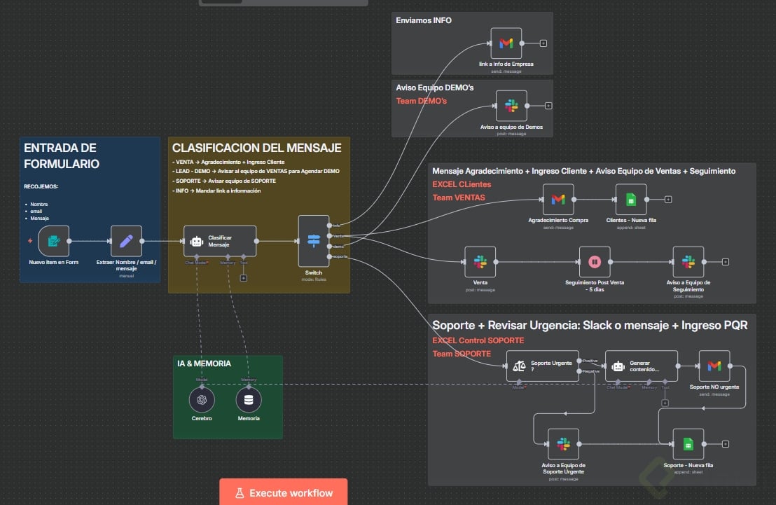 - Valida el enrutamiento por intención con IA: demo, info, soporte, compra.