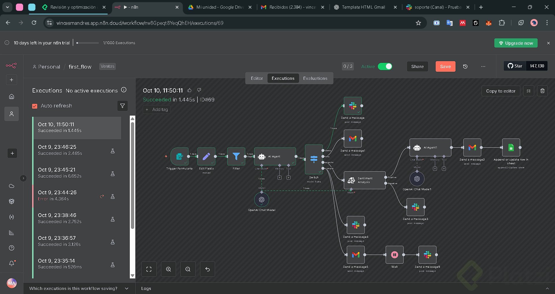 Trabajar en test y pasar a producción requiere un cambio simple pero crítico. Activa tu workflow, prueba con datos reales y valida resultados desde la vista de ejecuciones.