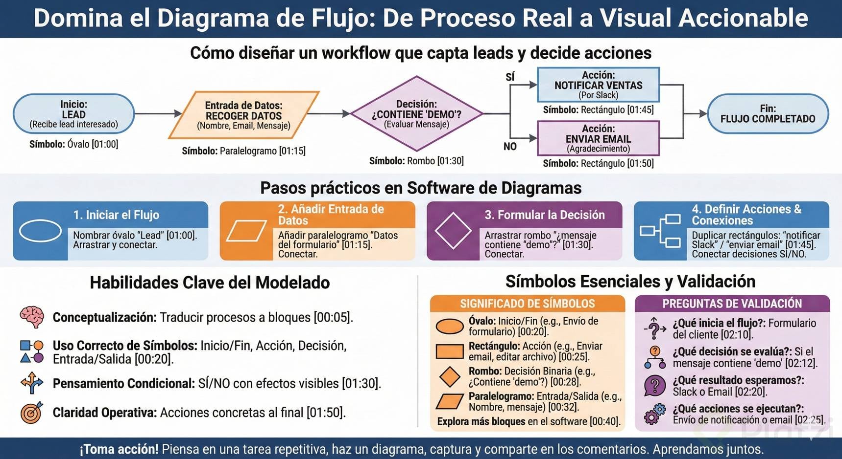 Domina cómo convertir un proceso real en un diagrama de flujo claro y accionable: desde recibir un lead hasta decidir si activar al equipo de ventas por Slack o enviar un email de agradecimiento. Aquí verás los símbolos esenciales, el orden lógico y las preguntas que validan un workflow efectivo.