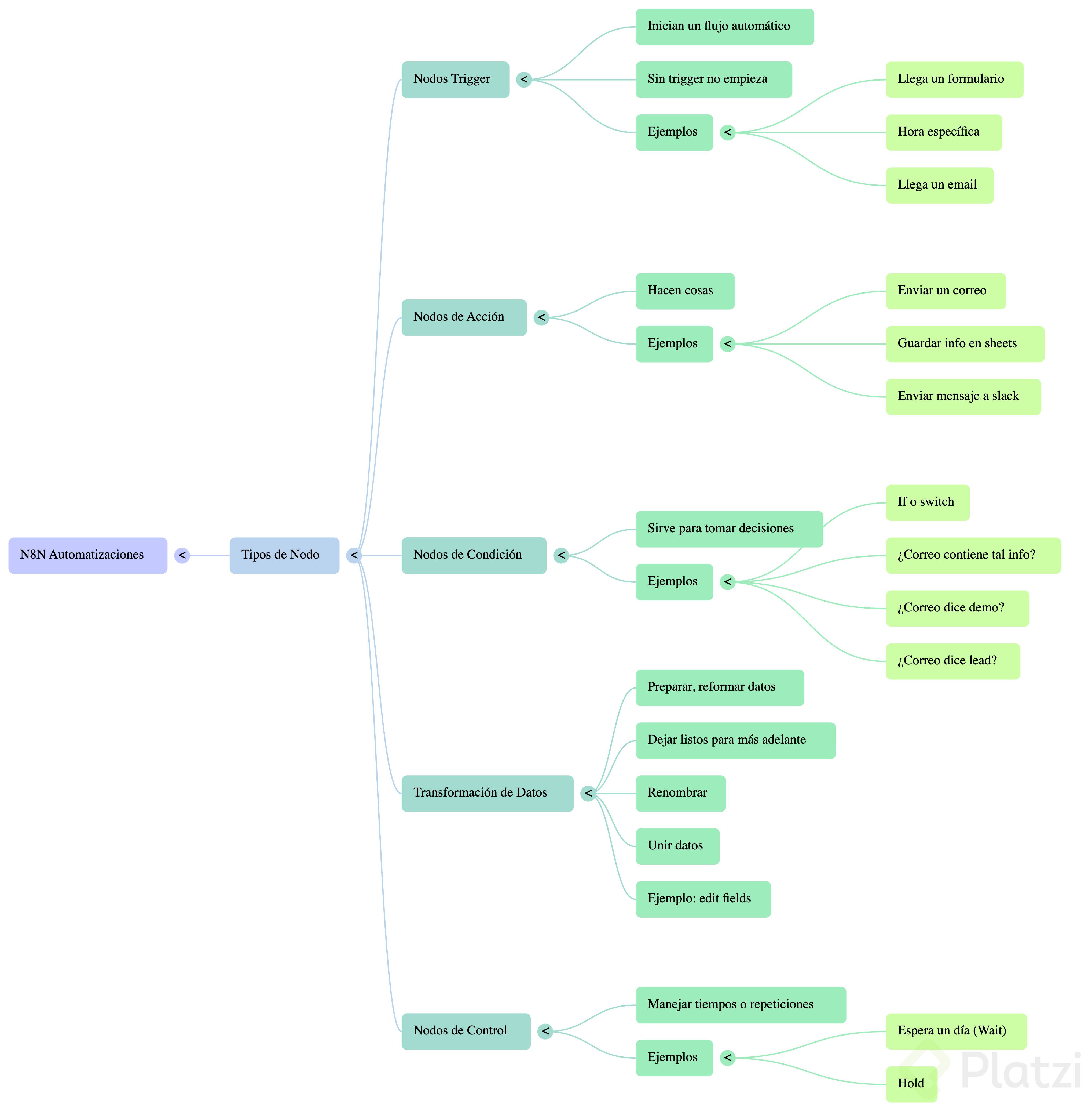 Aprende a construir automatizaciones robustas con N8N. Conecta bloques inteligentes llamados nodos para crear un workflow claro y eficiente. Aquí verás cómo usar cinco tipos de nodos —trigger, acción, condición, transformación de datos, control y espera— para pasar de una idea a una secuencia automatizada que funciona sola.